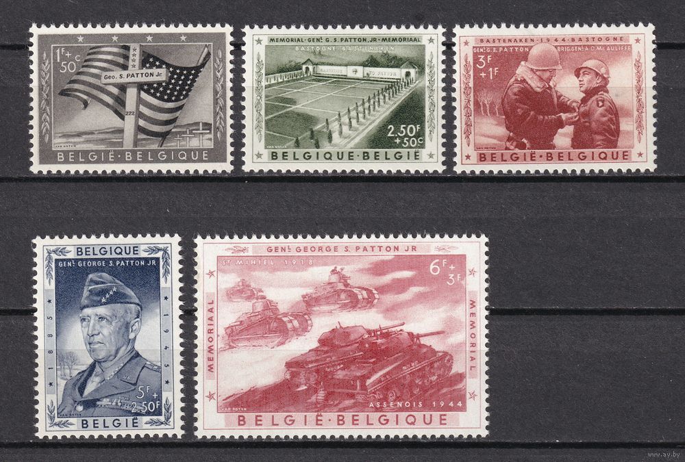 89.Bg. Бельгия. Генерал Джордж Смит Паттон. 1957 г. Полная серия. Mi.##1077 -1081(* Состояние хорошее. Клей, наклейки или следы от наклейки).