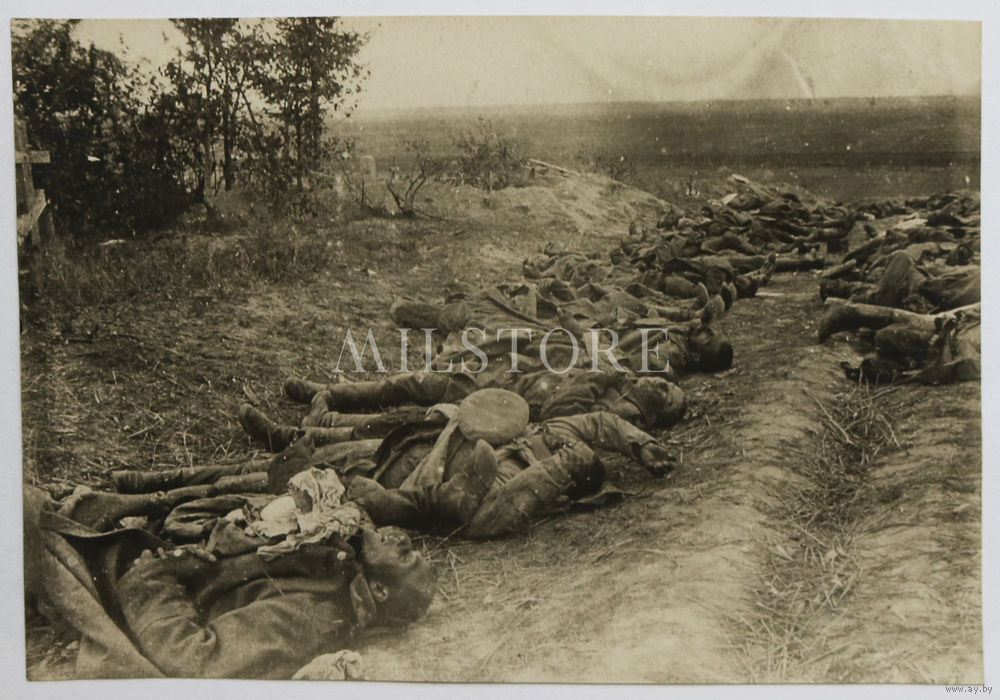 Фотография из альбома 94-го Енисейского полка, сделанная в Браславском районе Витебской области. Изображены убитые солдаты русской армии, погибшие в бою у м. Козяны (ныне агрогородок). Размер около 11,5 см. на 8 см. Фотография отличного качества, скан это не совсем передает. О боях полка в р-не Козянов можно почитать в журнале боевых действий полка.
