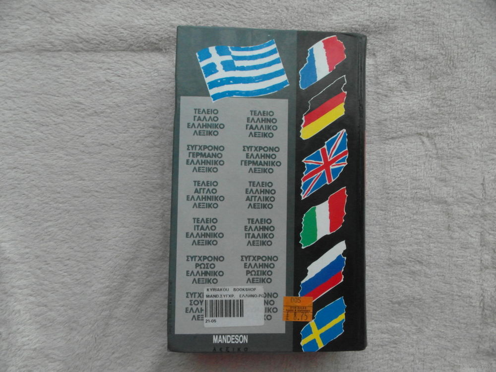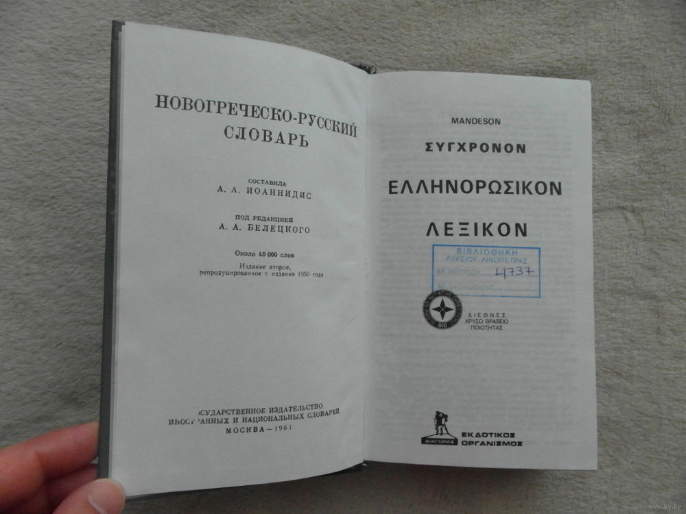 А.А. Иоаннидис Новогреческо-русский словарь. Около 40 000 слов. Составила А.А. Иоаннидис. Под редакцией А.А. Белецкого. Издание второе, репродуцированное с издания 1950 года. Москва. Государственное издательство иностранных и национальных словарей 1961г.Настоящий словарь - первый новогреческо-русский словарь, изданный в СССР. Содержит 40000 слов. Словарь рассчитан на русского читателя, включает в себя наиболее распространенные слова. Также в книгу включен `Краткий очерк грамматики новогреческого языка`.