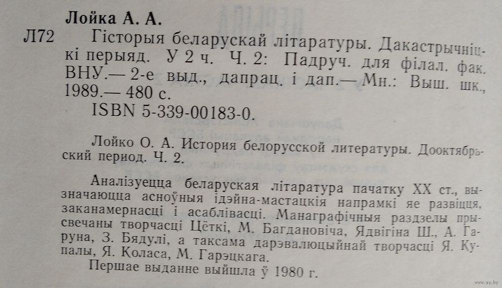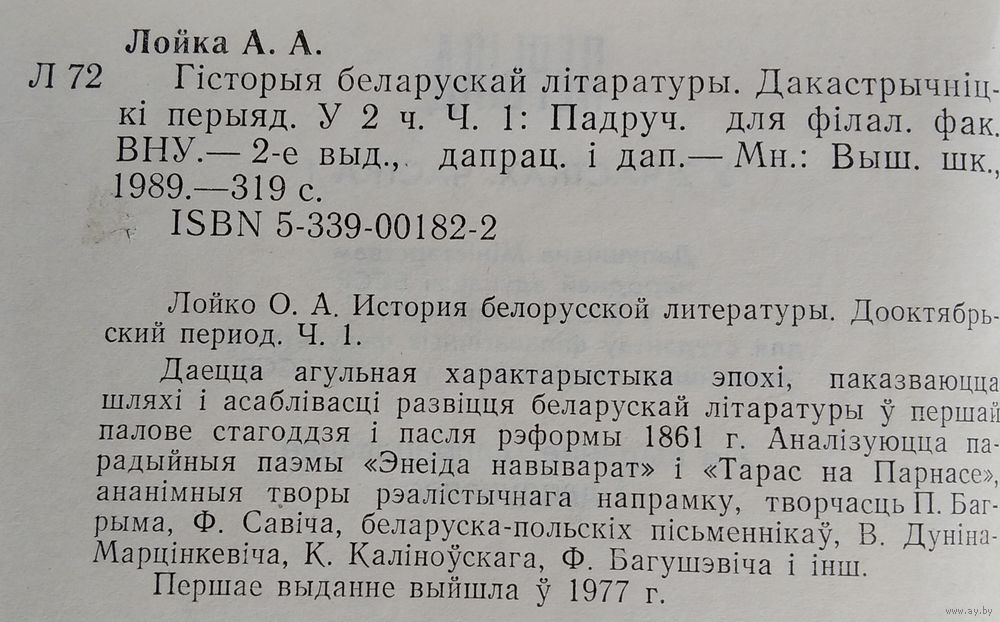 А. А. Лойка. Гісторыя беларускай літаратуры: дакастрычніцкі перыяд: падручнік для філалагічных факультэтаў вышэйшых навучальных устаноў БССР: у 2 ч. 2-е выд., дапрацаванае і дапоўненае. - Мінск : Вышэйшая школа, 1989 г. 318 + 478 с. Цверды пераплет.
