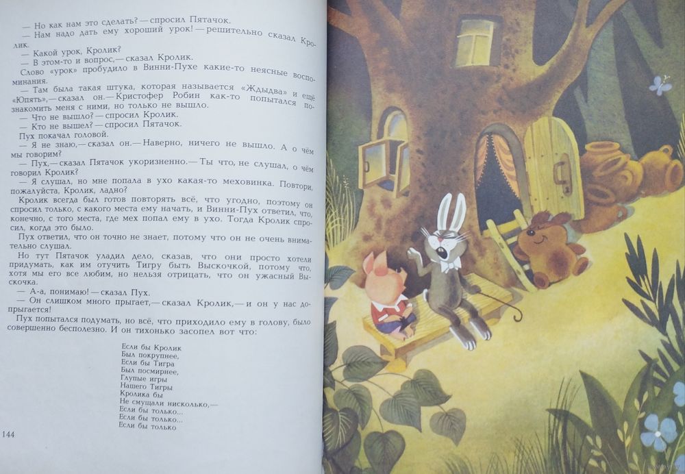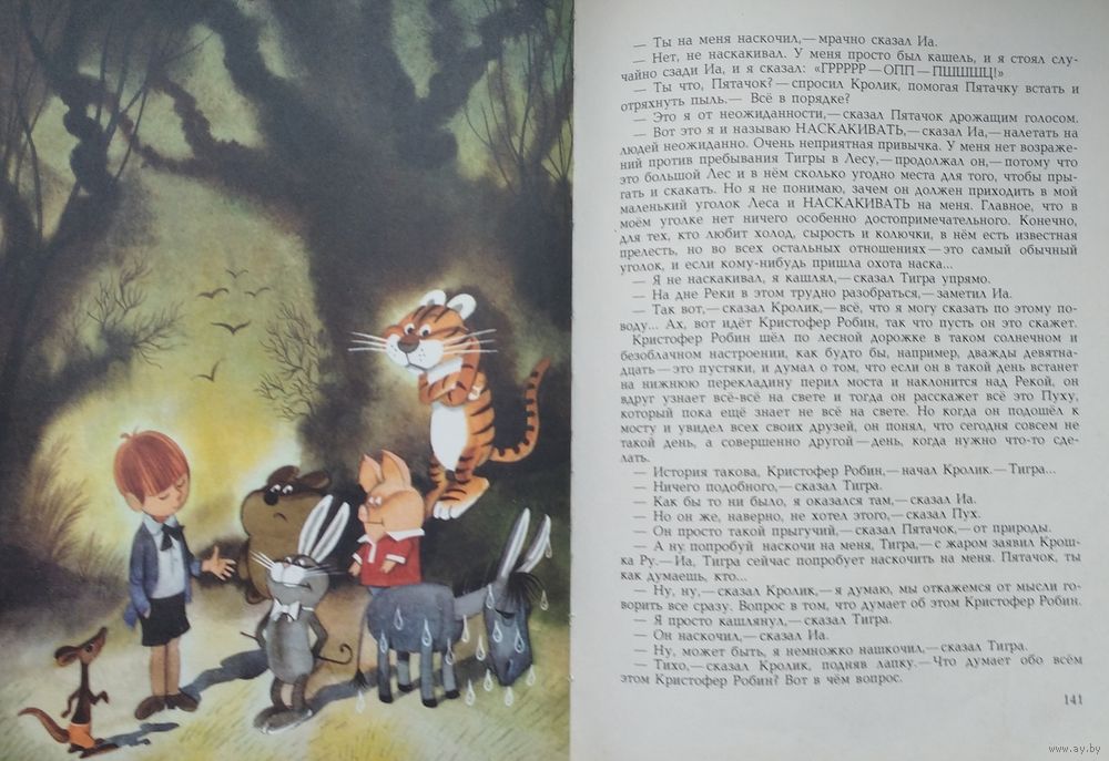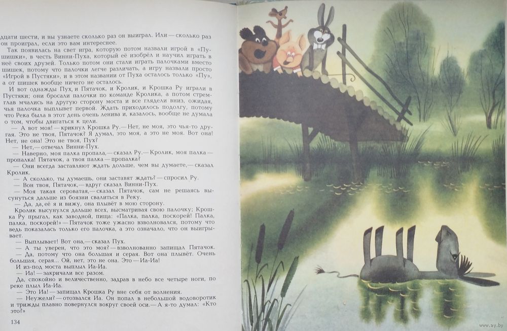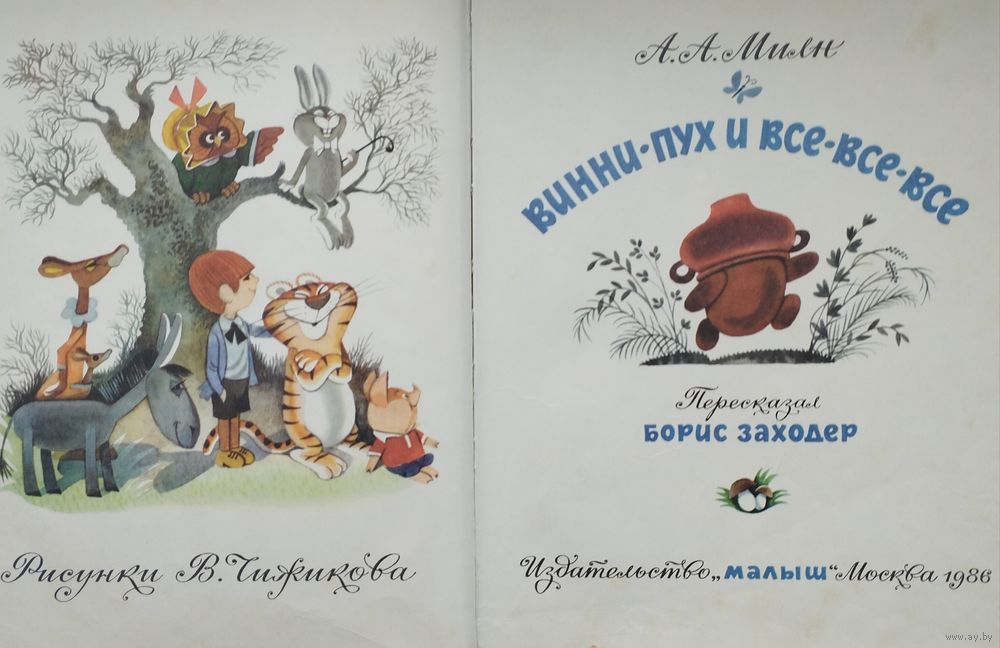 Большой энциклопедический формат. Ляссе. 192 стр. Первое издание иллюстраций. Рисунки В. Чижикова. Пересказал Борис Заходер. В это издание, кроме двух повестей - собственно, Винни-Пуха и Дома на Пуховой опушке, - вошли две новые главы и несколько новых песенок. Многочисленные цветные иллюстрации В. Чижикова - заставки, концовки, в пол-листа, в лист и в разворот.