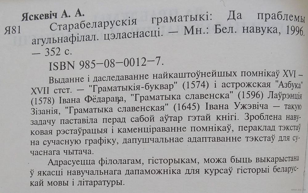А. А. Яскевіч. Старабеларускія граматыкі: да праблемы агульнафілалагічнай цэласнасці. Мінск : Беларуская навука, 1996 г. 350 с. Мяккая вокладка.