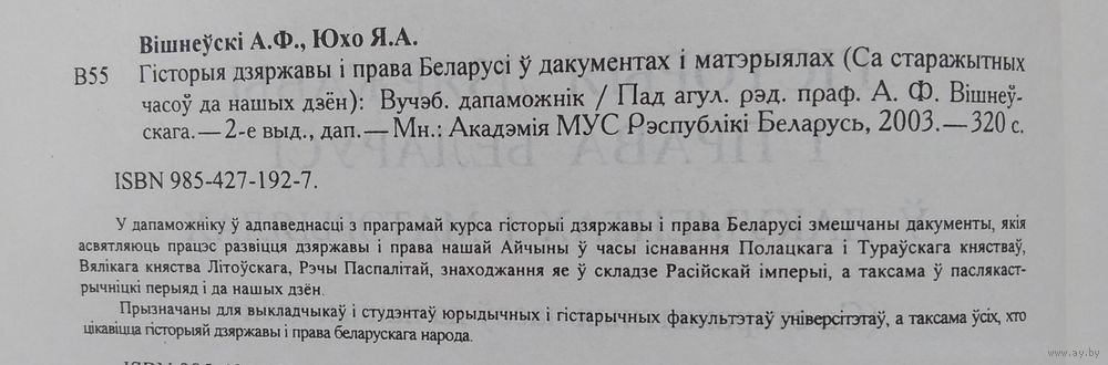 А. Ф. Вішнеўскі, Я. А. Юхо. Гісторыя дзяржавы і права Беларусі ў дакументах і матэрыялах: (са старажытных часоў да нашых дзён): вучэбны дапаможнік. Мінск : Акадэмія МУС. 2003 г. 320 с. Цверды пераплет.