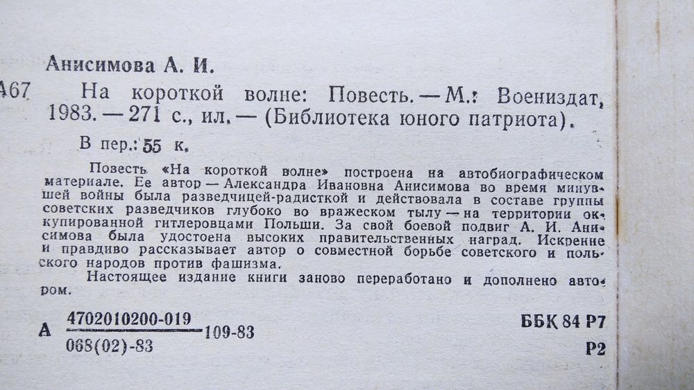 Повесть `На короткой волне` построена на автобиографическом материале. Ее автор — Александра Ивановна Анисимова во время Великой Отечественной войны была разведчицей — радисткой и действовала в составе группы советских разведчиков глубоко во вражеском тылу — на территории оккупированной гитлеровцами Польши. За свой боевой подвиг А.И. Анисимова была удостоена высоких правительственных наград. Искренне и правдиво рассказывает автор о совместной борьбе советского и польского народов против фашизма.