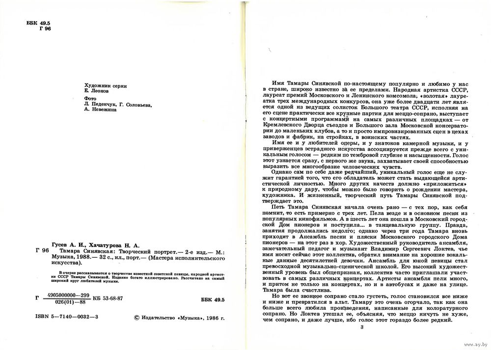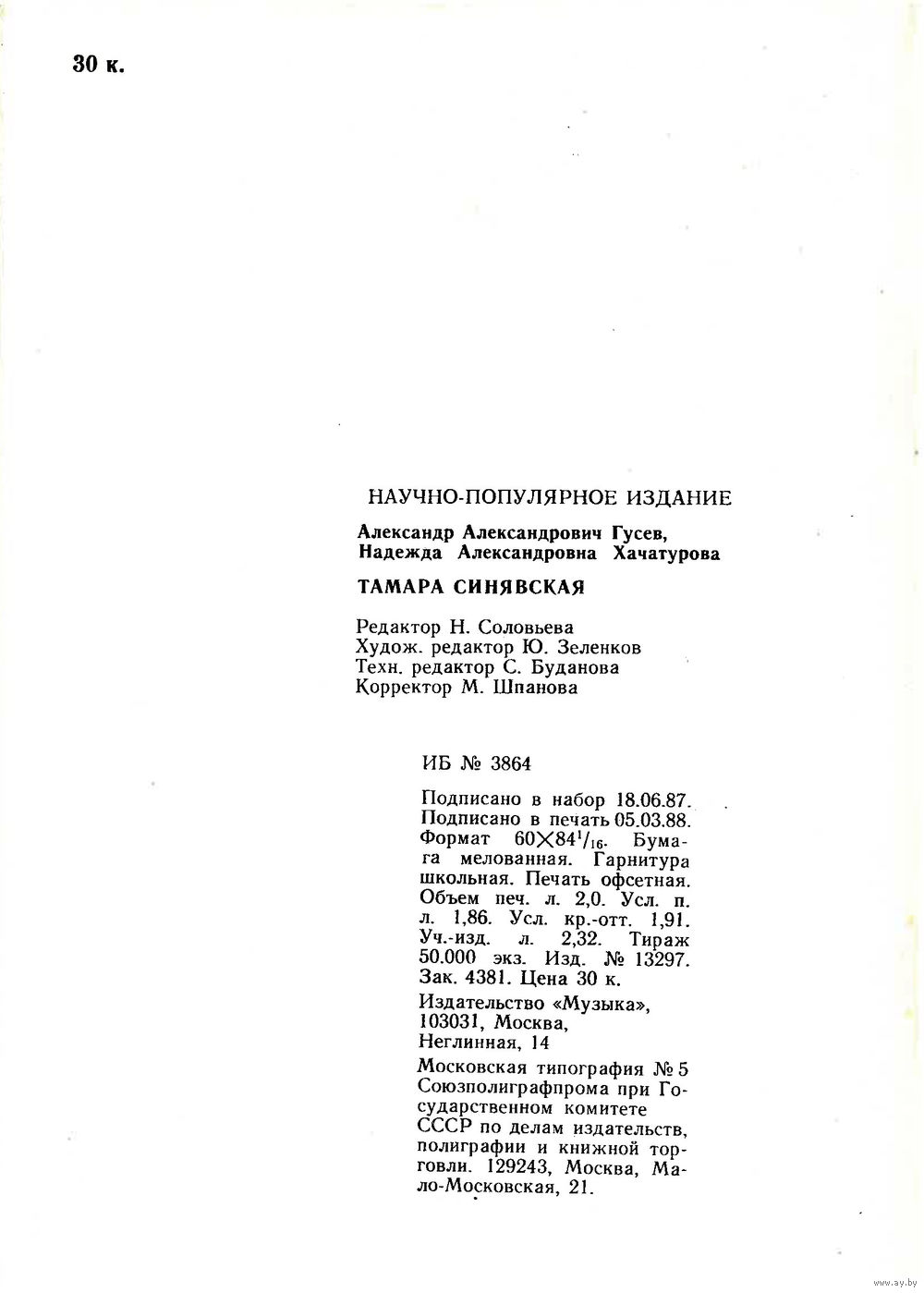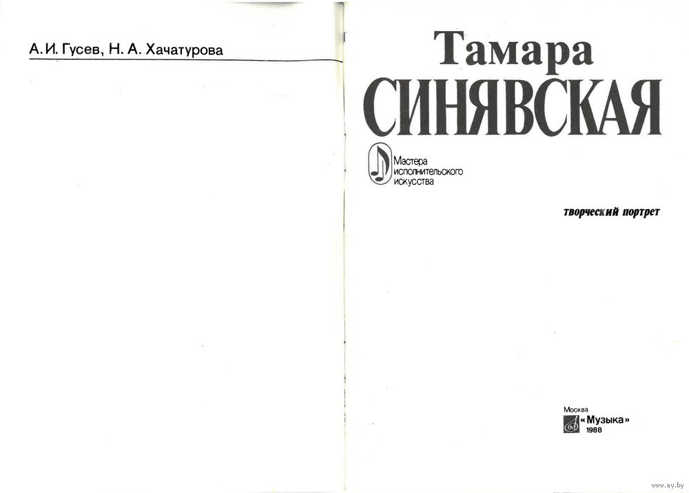 Тамара Синявская: Творческий портрет.— 2-е изд.— М.: Музыка, 1988.— 32 с., ил., порт.— (Мастера исполнительского искусства).