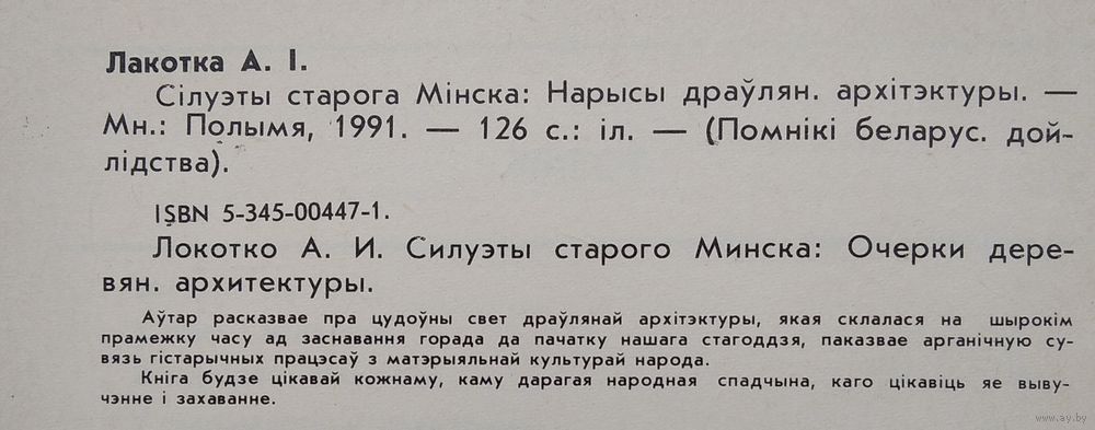 А. І. Лакотка. Сілуэты старога Мінска: нарысы драўлянай архітэктуры. Серыя: Помнікі беларускага дойлідства. Мінск. Полымя. 1991 г. 124 с. Мяккая вокладка.