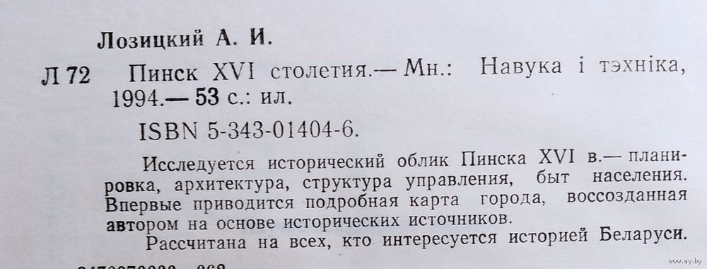 А. И. Лозицкий. Пинск XVI столетия. Минск : Навука і тэхніка, 1994 г. 51 с. Мягкая обложка.