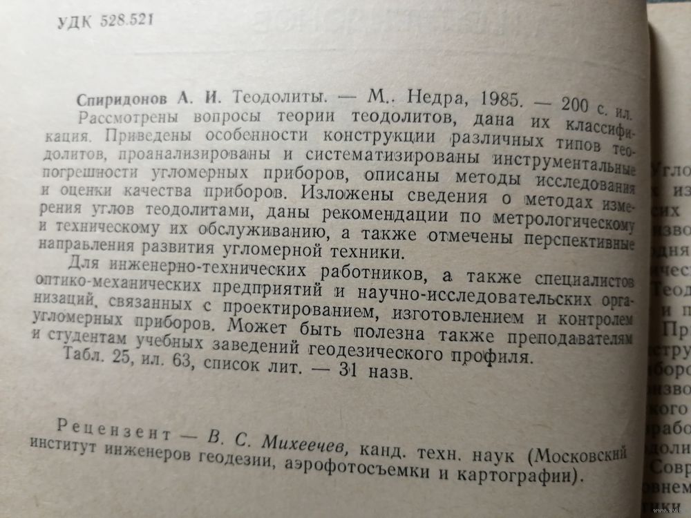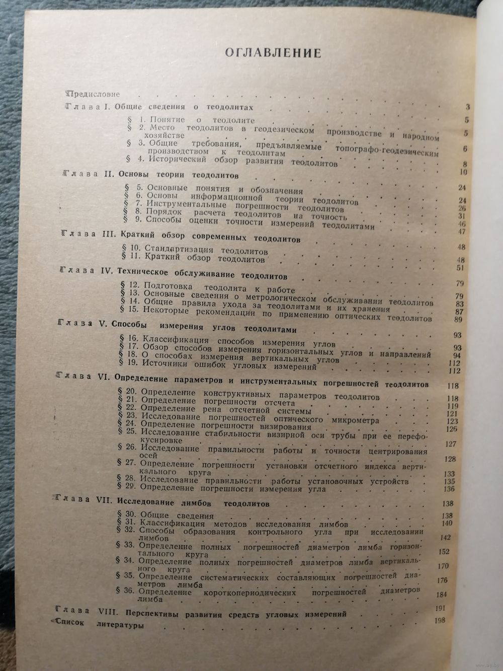 Рассмотрены вопросы теории теодолитов, дана их классификация. Приведены особенности конструкции различных типов теодолитов, проанализированы и систематизированы инструментальные погрешности угломерных приборов, описаны методы исследования и оценки качества приборов. Изложены сведения о методах измерения углов теодолитами, даны рекомендации по метрологическому и техническому их обслуживанию, а также отмечены перспективные направления развития угломерной техники. Для инженерно-технических работников, а также специалистов оптико-механических предприятий и научно-исследовательских организаций, связанных с проектированием, изготовлением и контролем угломерных приборов. Может быть полезна также преподавателям и студентам учебных заведений геодезического профиля.