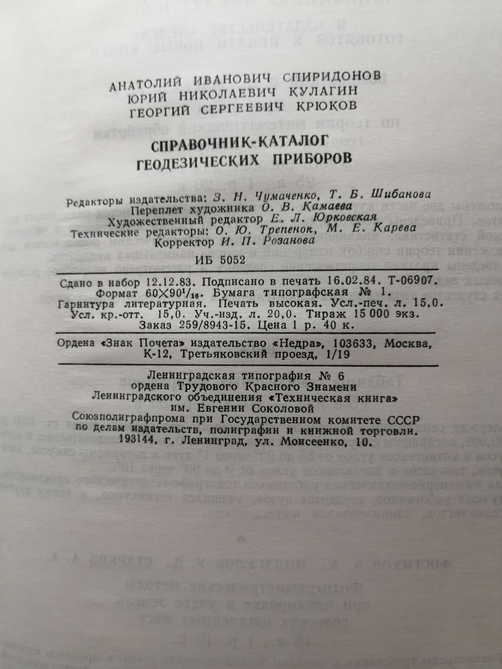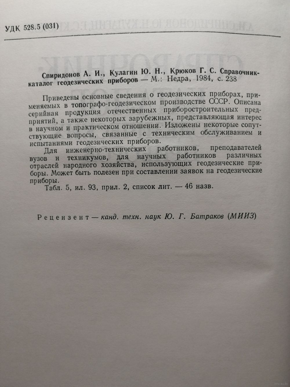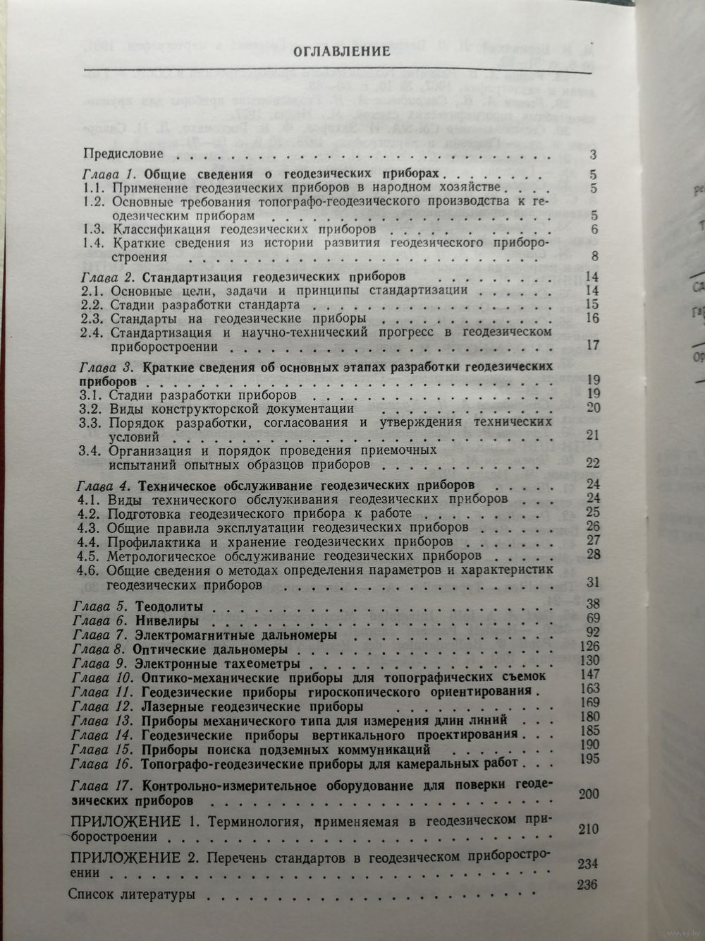 Приведены основные сведения о геодезических приборах, применяемых в топографо-геодезическом производстве СССР. Описана серийная продукция отечественных приборостроительных предприятий, а также некоторых зарубежных, представляющая интерес в научном и практическом отношении. Изложены некоторые сопутствующие вопросы, связанные с техническим обслуживанием и испытаниями геодезических приборов. Для инженерно-технических работников, преподавателей вузов и техникумов, для научных работников различных отраслей народного хозяйства, использующих геодезические приборы. Может быть полезен при составлении заявок на геодезические приборы.