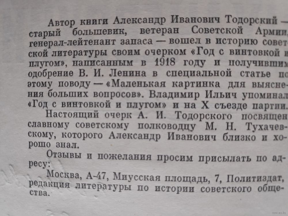 Автор книги Александр Иванович Тодорский - старый большевик, ветеран Советской Армии, генерал-лейтенант запаса - вошел в историю советской литературы своим очерком "Год с винтовкой и плугом", написанным в 1918 году и получившим одобрение В.И.Ленина в специальной статье по этому поводу - "Маленькая картинка для выяснения больших вопросов". Владимир Ильич упоминал "Год с винтовкой и плугом" и на X съезде партии.