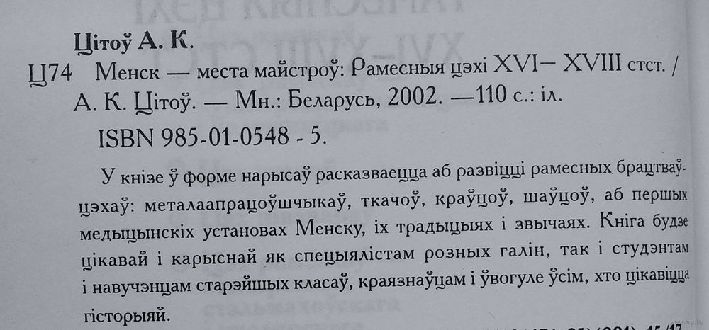 А. К. Цітоў. Менск - места майстроў: Рамесныя цэхi XVI-XVIII стст. Мінск : Беларусь, 2002 г. 109 с. Мяккая вокладка.
