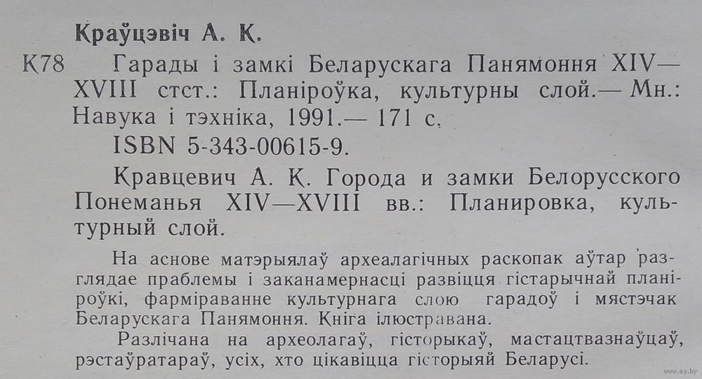 А. К. Краўцэвіч.Гарады i замкi Беларускага Панямоння XIV―XVIII cтст.: планіроўка, культурны слой. Мінск : Навука і тэхніка, 1991 г. 170 с. Цверды пераплет. Супервокладка.