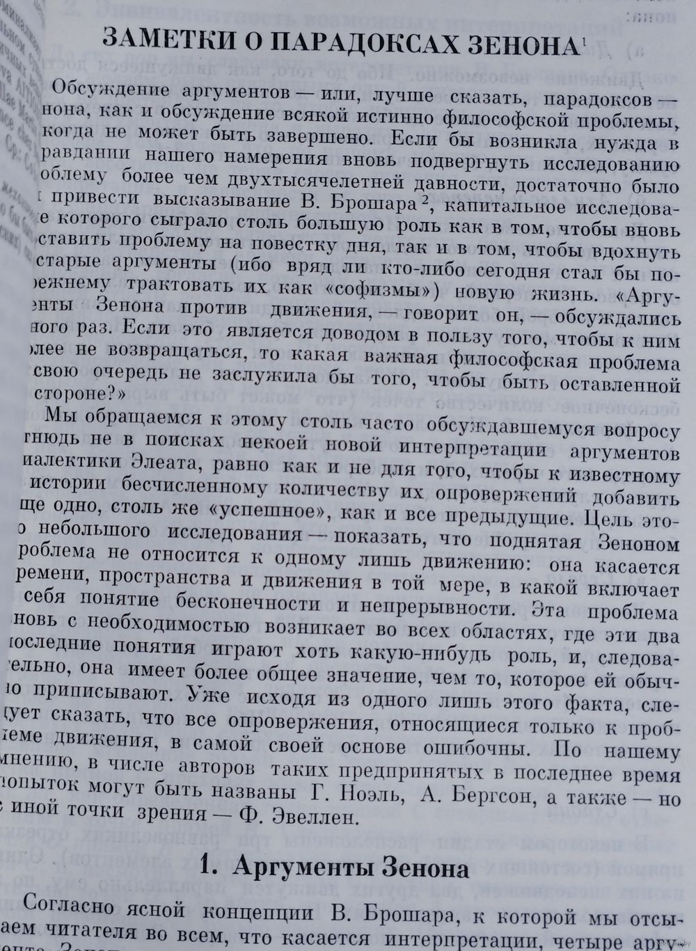 Наиболее ранняя по времени статья посвящена парадоксам Зенона, проблеме бесконечности и непрерывности. Она знакомит читателя с подходом молодого Койре к этой проблеме.