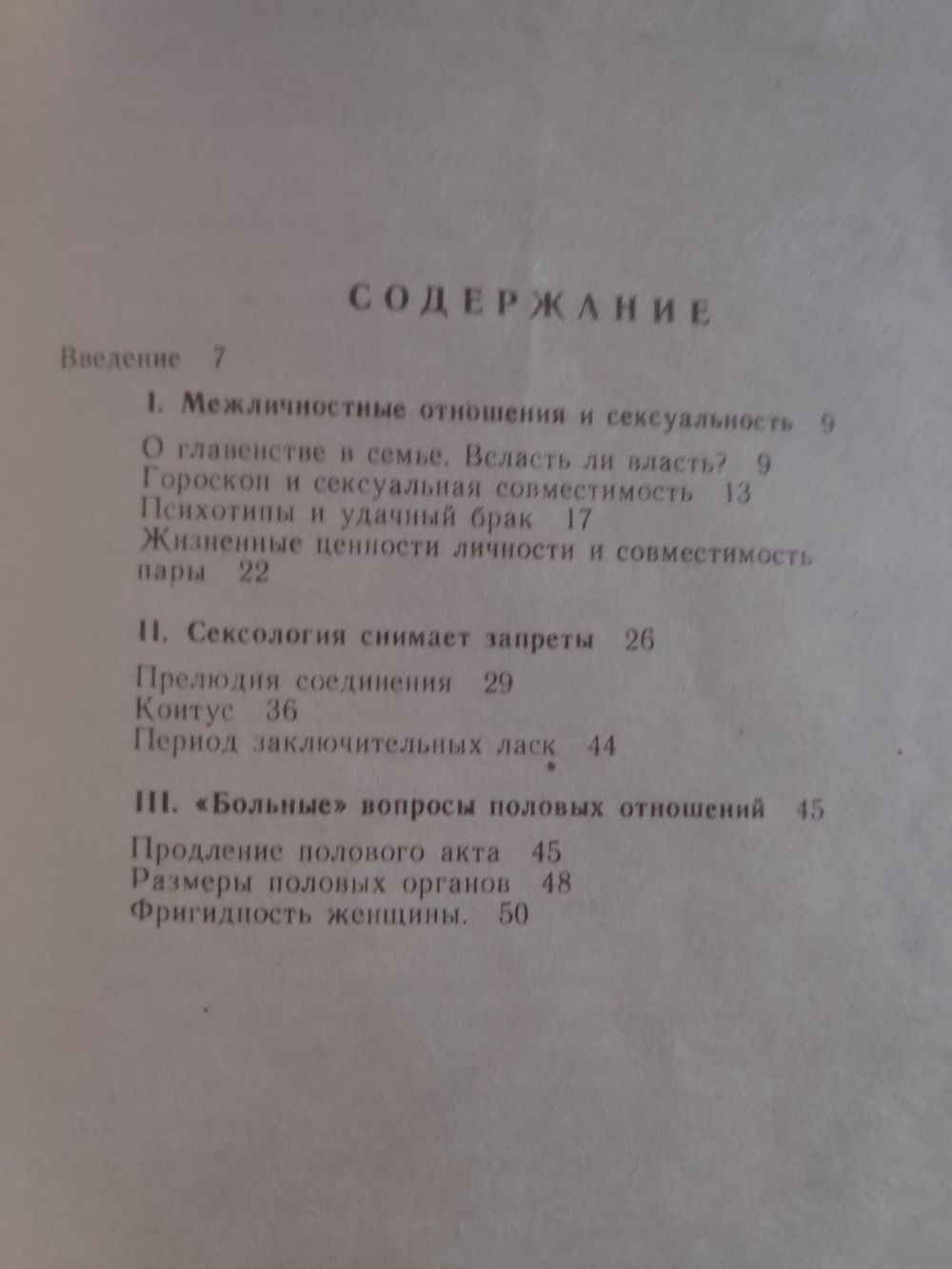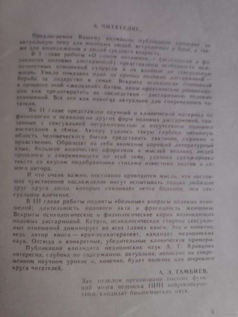 В третьей главе работы подняты "больные" вопросы половых отношений: длительность полового акта и фригидность женщины. Вскрыты психологические и физиологические корни возникающих половых дисгармоний. Кстати, психологическая сторона сексуальных отношений доминирует во всех главах книги. Это и понятно, ведь автор книги - врач-психотерапевт, кандидат медицинских наук. Отсюда и конкретные, убедительные клинические примеры.