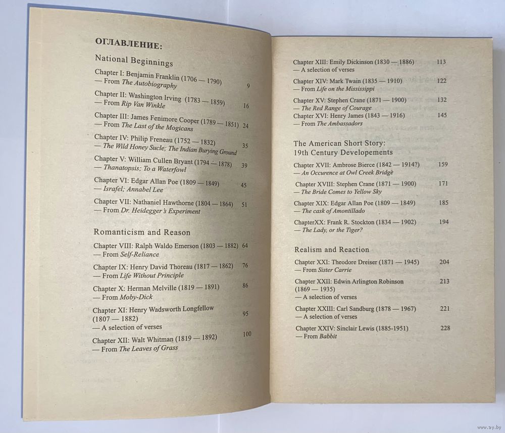 Впервые издаваемая в России хрестоматия американской литературы, подготовленная по материалам Университета штата Мериленд, включает отрывки из произведений классиков американской литературы, начиная с "Автобиографии" Б. Франклина и вплоть до современных писателей, среди которых: С. Льюис, У. Фолкнер, Дж. Стейнбек, Э. Хемингуэй, С. Беллоу, Р. Фрост и др. В хрестоматию включены неадаптированные тексты из произведений более 40 авторов — писателей и поэтов, по праву считающихся классиками американской литературы.