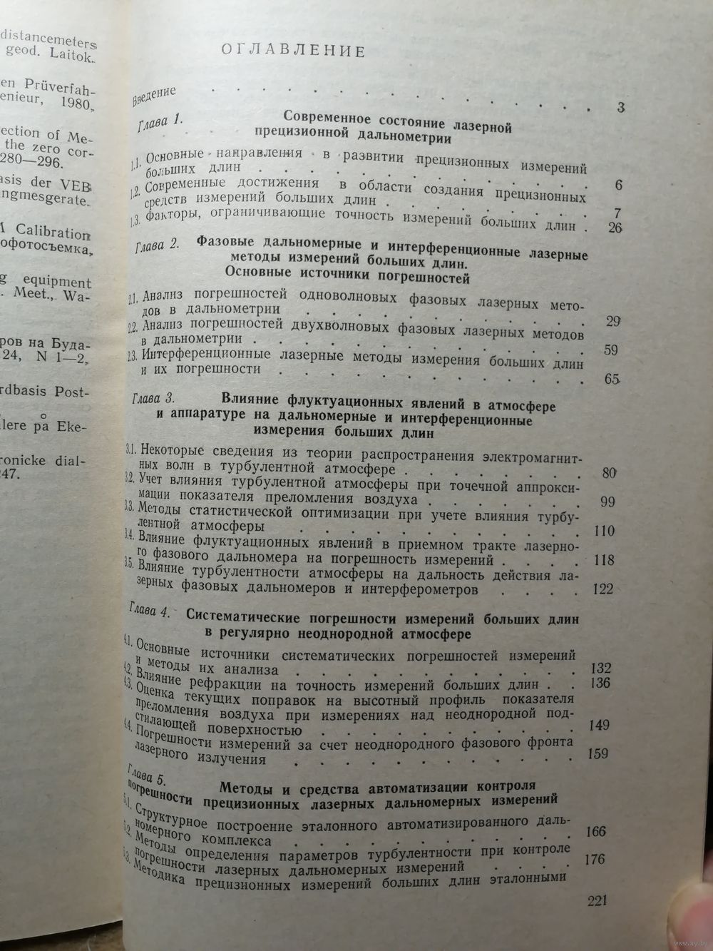 Книга посвящена вопросам анализа современного состояния методов и средств прецизионных измерений больших длин, факторов, ограничивающих их точность. Рассматриваются перспективные методы и средства лазерных дальномерных и интерференционных измерений больших длин; систематические и случайные погрешности измерений, методы минимизации или исключения отдельных групп этих погрешностей; возможные методы и средства контроля и учета внешних условий в процессе проведения прецизионных измерений больших длин в реальной атмосфере; методы и средства метрологического обеспечения данных измерений. Для научных и инженерно-технических работников, специализирующихся в области разработки и исследования методов и средств лазерной фазовой дальнометрии и интерферометрии, методов и средств их метрологического обеспечения, а также практического использования лазерных дальномеров и интерферометров.