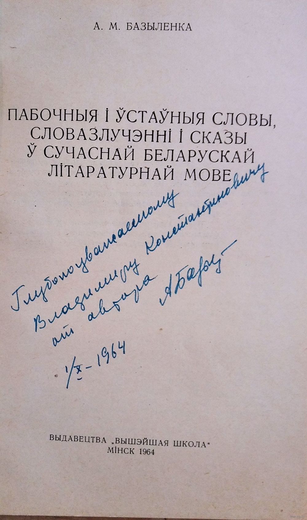 А. М. Базыленка. Пабочныя і ўстаўныя словы, словазлучэнні і сказы ў сучаснай беларускай літаратурнай мове. Аўтограф аўтара. Мінск : Вышэйшая школа, 1964 г. 110 с. Мяккая вокладка.