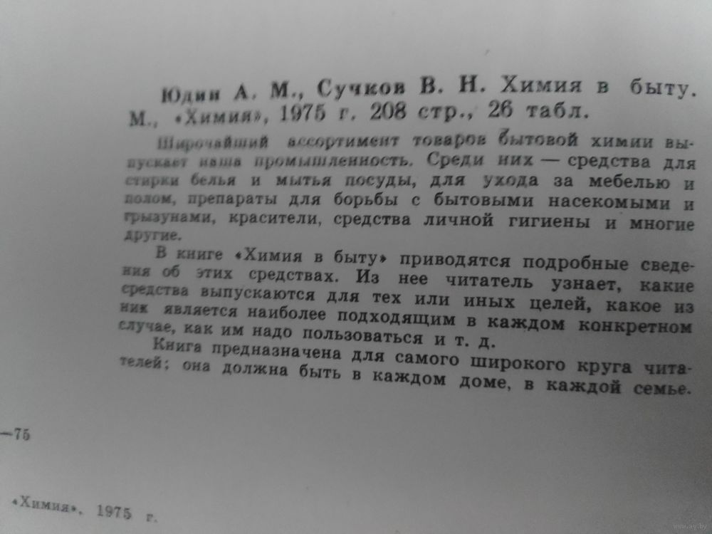 В книге «Химия в быту» приводятся подробные сведения об этих средствах. Из нее читатель узнает, какие средства выпускаются для тех или иных целей, какое из них является наиболее подходящим в каждом конкретном случае, как им надо пользоваться и т.д.
