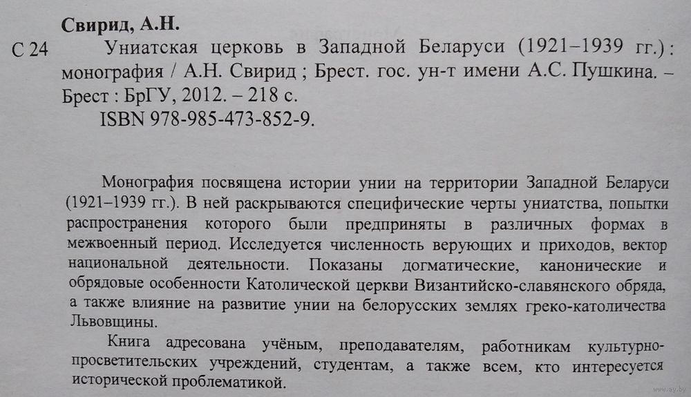 А. Н. Свирид. Униатская церковь в Западной Беларуси (1921-1939 гг.). Монография. Брест : БрГУ, 2012 г. 218 с. Мягкая обложка.