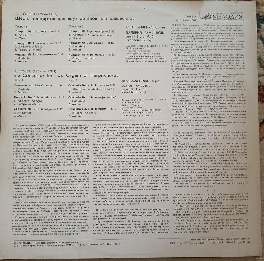A. Soler - Oleg Yanchenko, Valeri Kamyshov – Six Concertos For Two Organs Or Harpsichords