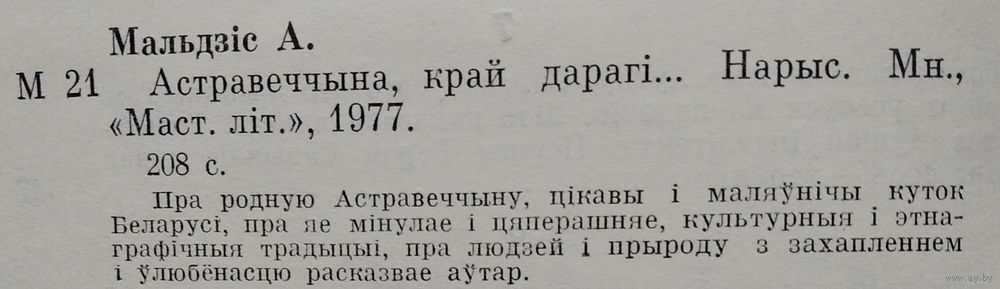 Адам Мальдзіс. Астравеччына, край дарагі. Мінск : Мастацкая літаратура, 1977 г. 206 с. Цверды пераплет.