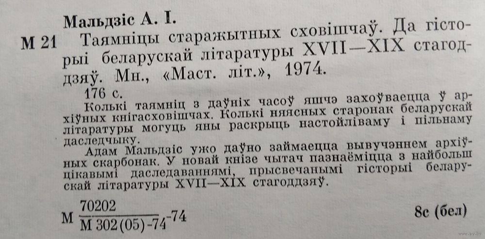 Адам Мальдзіс. Таямніцы старажытных сховішчаў: да гiсторыi беларускай лiтаратуры ХVII-XIX стагоддзяў. Мінск : Мастацкая літаратура, 1974 г. 175 с. Цверды пераплет. Супервокладка.