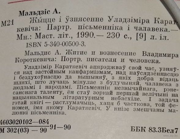 Адам Мальдзіс. Жыццё і ўзнясенне Уладзіміра Караткевіча: партрэт пісьменніка і чалавека. Мінск : Мастацкая літаратура, 1990 г. 229 с. Цверды пераплет.