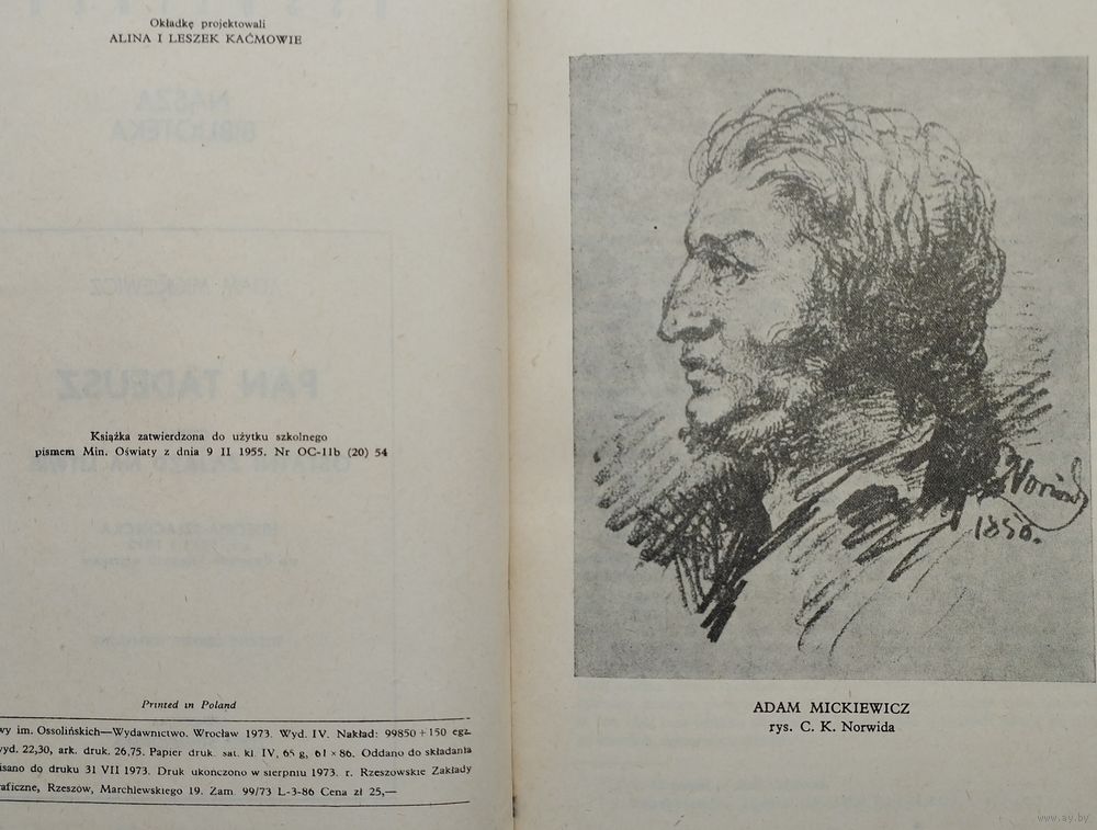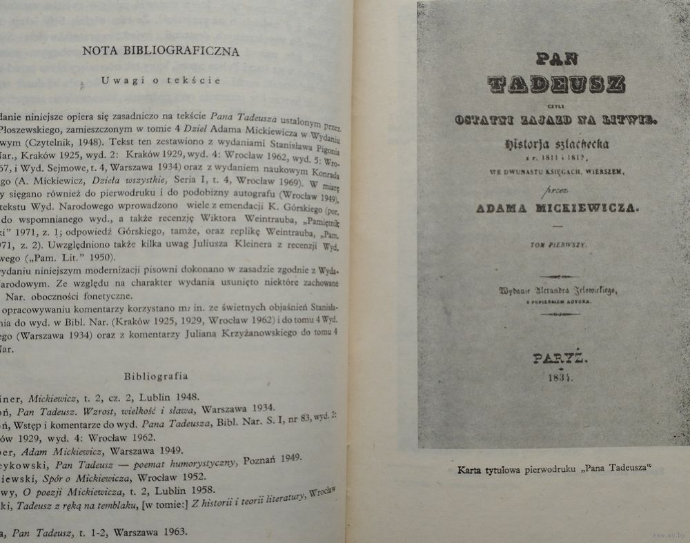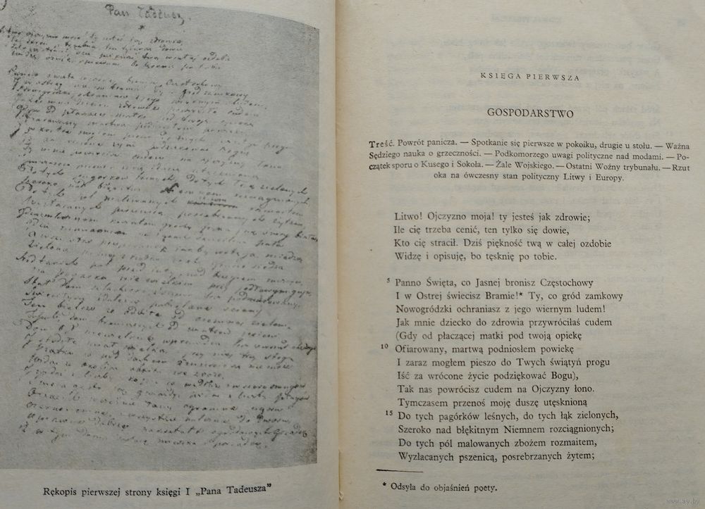 Большой формат. Тираж 5000 экз. 428 стр. На пол. яз. Adam Mickiewicz "Pan Tadeusz czyli Ostatni Zajazd na Litwie : historia szlachecka z roku 1811 i 1812 we dwunastu księgach wierszem." Полное название — «Пан Тадеуш, или Последний наезд на Литве. Шляхетская история 1811—1812 годов в двенадцати книгах, писанная стихами» (Pan Tadeusz czyli Ostatni zajazd na Litwie. Historia szlachecka z roku 1811 i 1812 we dwunastu księgach wierszem pisana). «Наезд» (пол. zajazd) — способ исполнения решения суда, практиковавшийся шляхтой давней Речи Посполитой, заключавшийся в насильственном захвате чьего-либо имения или земли, которую пользователь не желал возвращать законному владельцу. Действие поэмы происходит на протяжении пяти дней в 1811 году и одного дня в 1812 году на берегах Немана, «на Литве» (в бывшем Великом княжестве Литовском) перед нашествием Наполеона на Россию. Главные герои поэмы — Тадеуш и Зося, представители двух соперничающих шляхетских фамилий — Соплиц и Горешков. Замысел поэмы перерос из идиллии (образцом для которой была идиллия Гёте «Герман и Доротея») в широкую эпическую картину, сочетающую бытовую, военную, любовную и патриотическую линии. В поэме настолько правдиво и подробно воссозданы картины жизни, быта и нравов польской и литовской шляхты (описание охоты, пиров, празднеств, обычаев), что ещё при жизни автора она получила характеристику «Энциклопедия польской жизни». «Пан Тадеуш» был последним крупным художественным произведением Мицкевича, впоследствии он практически перестал писать стихи и в последние двадцать лет жизни в основном сосредоточился на публицистике. «Пан Тадеуш» начинается со знаменитого признания в любви к Литве (Мицкевич родился близ Новогрудка, ныне Беларусь): Litwo! Ojczyzno moja! ty jesteś jak zdrowie.