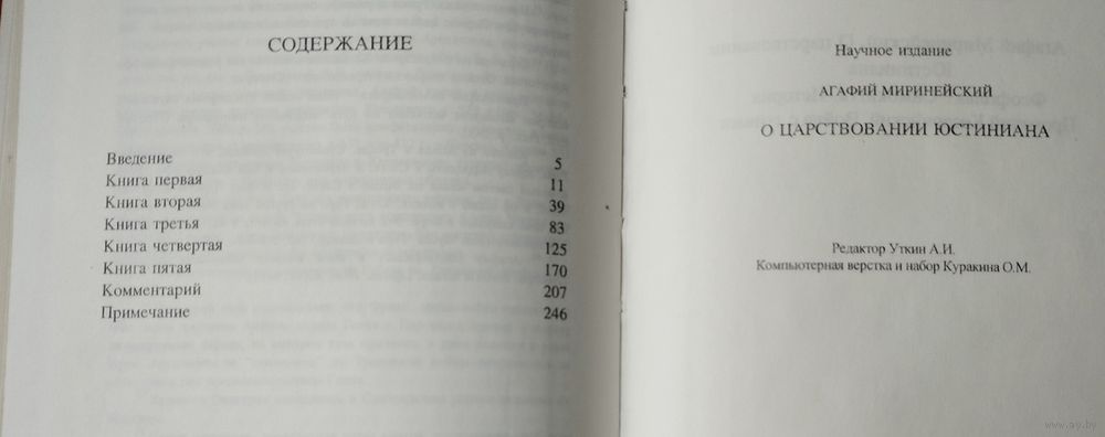 Цена за 1 том. Тираж 3000 экз. 258 стр. Агафий Миринейский (лат. Agathias Scholasticus, ср.-греч. Ἀγαθίας Σχολαστικός; 536—582) — восточноримский поэт и ранний историк, часто называемый также Схоластиком (ср.-греч. σχολαστικός — адвокат) в связи с его профессиональной деятельностью, сын ритора Мемнония. После тридцати лет Агафий от поэзии обратился к жанру хроники, написав труд «О царствовании Юстиниана» в пяти книгах, продолжающий исторические работы Прокопия Кесарийского.