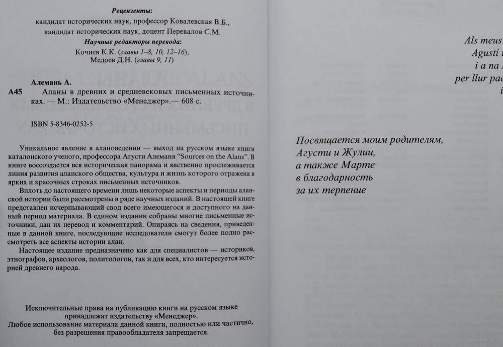 Большой формат. Тираж 3000 экз. 608 стр. Уникальное явление в алановедении – выход на русском языке книги каталонского учёного, профессора Агусти Алеманя «Sources on the Alans». В книге воссоздаётся вся историческая панорама и явственно прослеживается линия развития аланского общества, культура и жизнь которого отражена в ярких и красочных строках письменных источников. Вплоть до настоящего времени лишь некоторые аспекты и периоды аланской истории были рассмотрены в ряде научных изданий. В настоящей книге представлен исчерпывающий свод всего имеющегося и доступного на данный период материала. В едином издании собраны многие письменные источники, дан их перевод и комментарий. Опираясь на сведения, приведённые в данной книге, последующие исследователи смогут более полно рассмотреть все аспекты истории алан. Настоящее издание предназначено как для специалистов – историков, этнографов, археологов, политологов, так и для всех, кто интересуется историей древнего народа. Содержание: