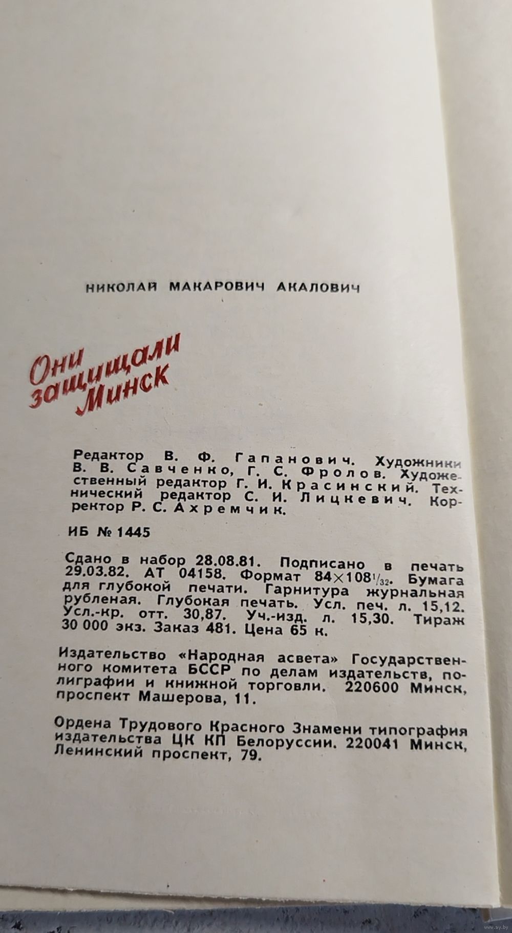 Акалович. Они защищали Минск. 1982. АВТОГРАФ АВТОРА