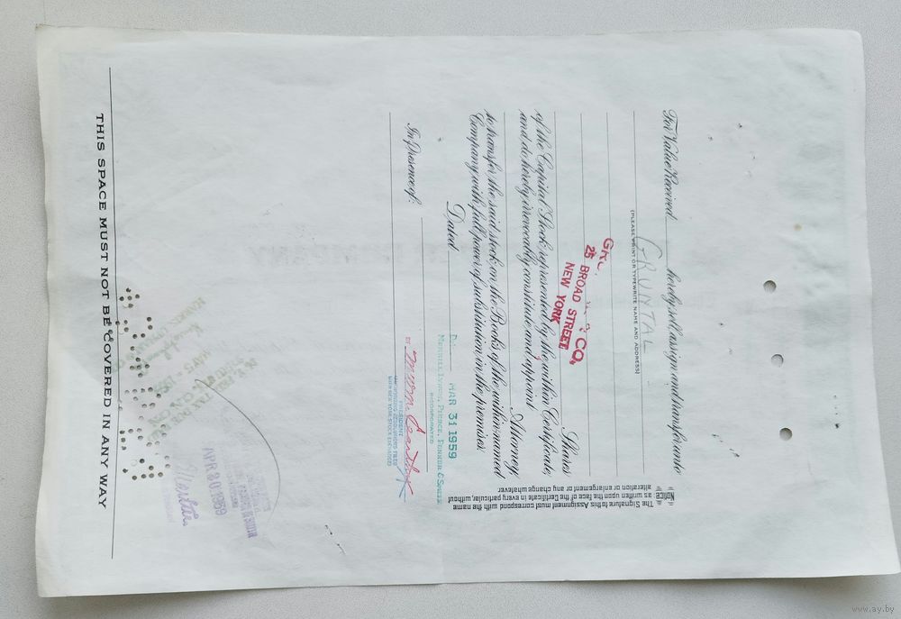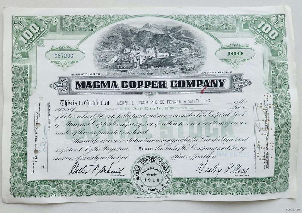 Сертификат датирован 26 марта 1959 года, серийный номер C87236, номинал — 100 акций стоимостью $10 каждая. Держателем акций являлся Merrill Lynch Pierce Fenner & Smith Inc – брокерское подразделение Bank of America. Документ изготовлен компанией Hamilton Bank Note Co. (Нью-Йорк), заверен подписями президента и казначея компании, а также круглой печатью Magma Copper Company.