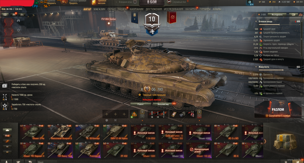 - 10 ур. (41): Об. 140, Об. 430У, ИС-7, Об. 277, Об. 705А, СТ-2, Об. 260, Об. 780, Об. 268, Об. 268 Вариант 4, Об. 261, E-50M, Leopard 1, E 100, JagdPanzer E 100, Sheridan, M48A5 Patton, T110E5, T57 Heavy, T92 HMC, AMX 13 105, Bat.Chat 25t, AMX 50B, AMX Mle.54, AMX 50 Foch B, Centurion Action X, Super Conqeror, FV215B, FV215B 183, TVP T50/51, VZ. 55, 121, WZ-111 5A, BZ-74-1, STB-1, CS-63, 60TP, Kranvagn, Progetto M40 mod.65, Rinoceronte, Minotauro