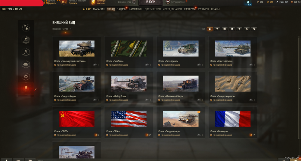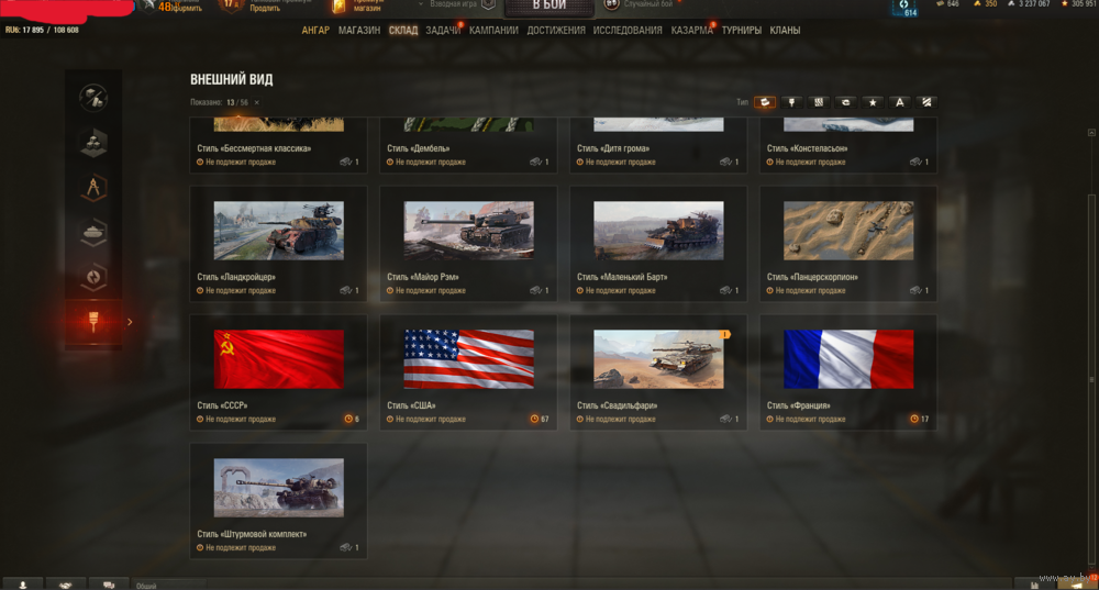 Аккаунт личный, зарегистрирован 2 мая 2011 года, много медалек, декалей, надписей, эмблем, 2д стилей, есть 3д стили (на технике и на складе). Также редкие танки (об.780 с личным номером (3д стиль), Fury, BZ-74-1, огромное количество премиум-техники и прокаченные экипажи разных наций.