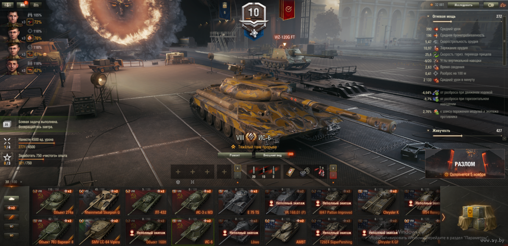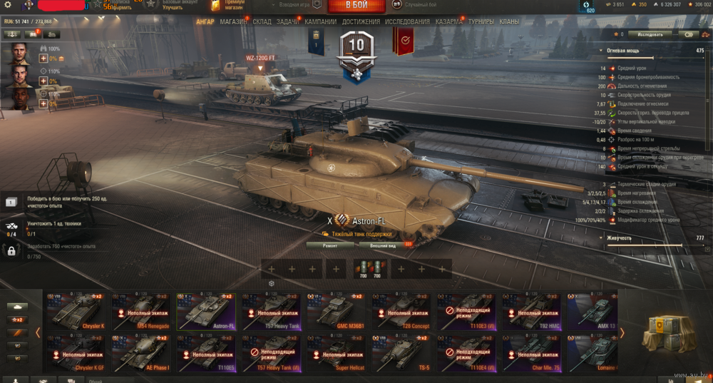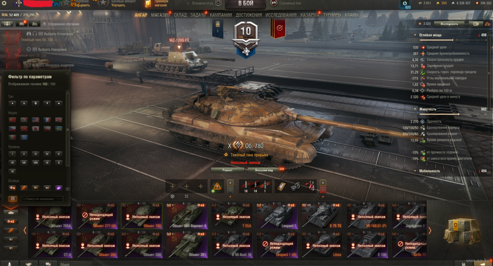 - 10 ур. (43): Об. 140, Об. 430У, ИС-7, Об. 277, Об. 705А, СТ-2, Об. 260, Об. 780, Об. 268, Об. 268 Вариант 4, Об. 261, E-50M, Leopard 1, E 100, JagdPanzer E 100, Sheridan, M48A5 Patton, T110E5, T57 Heavy, T92 HMC, AMX 13 105, Bat.Chat 25t, AMX 50B, AMX Mle.54, AMX 50 Foch B, Centurion Action X, Super Conqeror, FV215B, FV215B 183, TVP T50/51, VZ. 55, 121, WZ-111 5A, BZ-74-1, STB-1, CS-63, 60TP, Kranvagn, Progetto M40 mod.65, Rinoceronte, Minotauro, Aston-FL, Condor