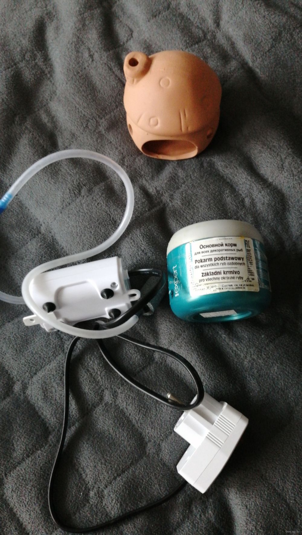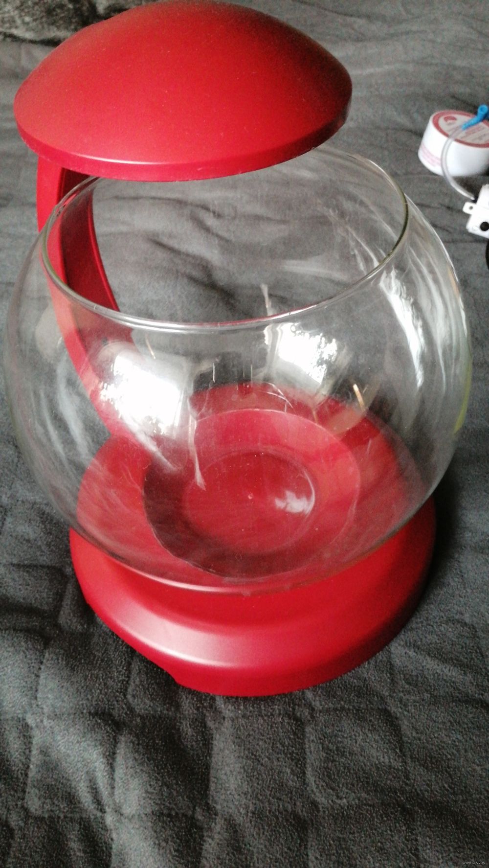 Продам круглый аквариум 6,8 л. Подсветка работает, водопад - нет. Вместе с ним отдам воздушный компрессор, домик для рыб и корм.