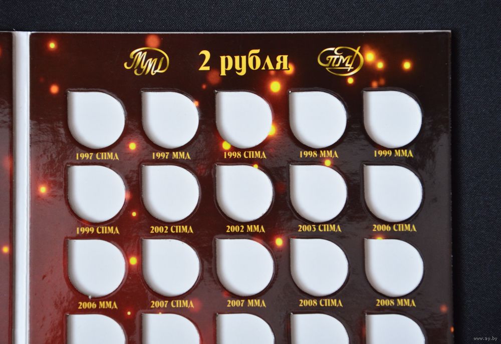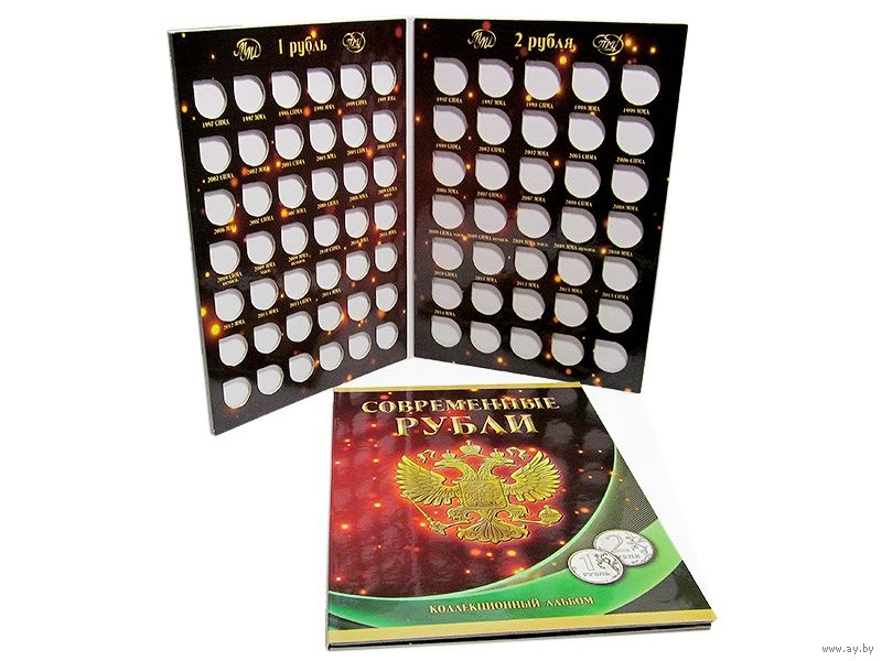 Альбом предназначен на монеты номиналом 1 рубль (42 ячейки) и 2 рубля (35 ячеек).