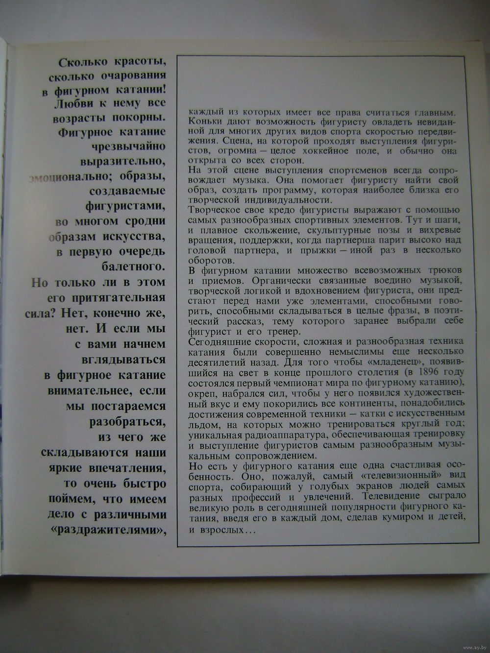 Сколько очарования в фигурном катании! Любви к нему все возрасты покорны. Фигурное катание чрезвычайно выразительно, эмоционально; образы, создаваемые фигуристами, во многом сродни образам искусства, в первую очередь балетного. Но только ли в этом его притягательная сила? Нет, конечно же, нет. И если мы с вами начнем вглядываться в фигурное катание внимательнее, если мы постараемся разобраться, из чего же складываются наши яркие впечатления, то очень быстро поймем, что имеем дело с различными "раздражителями".
