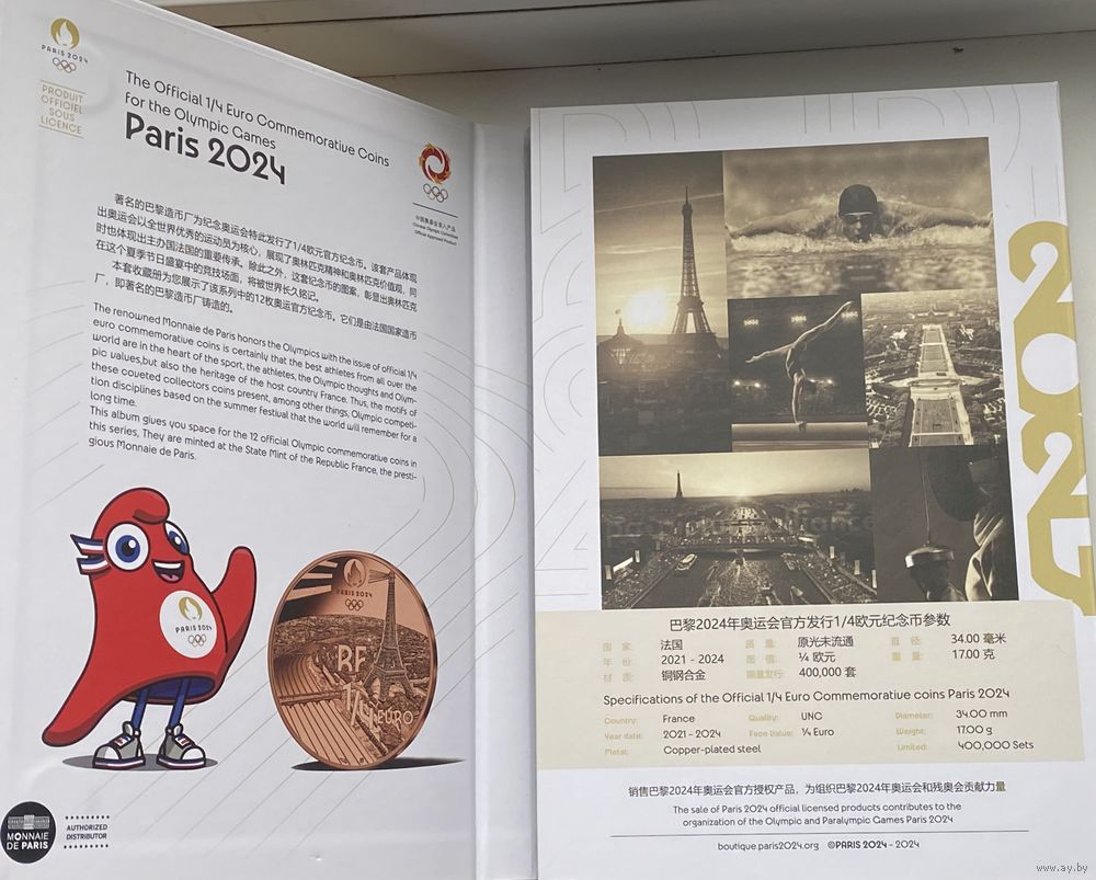 Альбом под 12 монет номиналом Франции 1/4 евро, посвященных Олимпиаде 2024 в Париже. Лицензионный