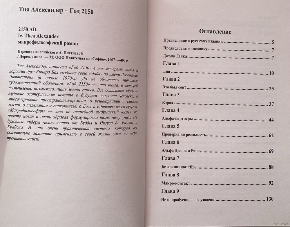 Тия Александер написала Год 2150 в то же время, когда ее хороший друг Ричард Бах создавал свою `Чайку по имени Джонатан Ливингстон`. Но если книга Ричарда выбрала для себя жанр краткой притчи, то у Тии получился `макрофилософский роман` - по слухам, вдохновивший Джона Леннона на написание знаменитой `утопической` песни. Да не обманется читатель художественной оболочкой: Год 2150 - это книга, в которой вымышлены лишь имена героев. Все остальное здесь - глубокие эзотерические истины о будущей эволюции человека, о многомерности пространства-времени, о реинкарнации и смысле жизни, о телепатии и психокинезе, о Боге и Единстве всего сущего. `Макрофилософия` - это не очередной выдуманный `изм`, но просто новая и очень здравая формулировка того, чему учили все духовные лидеры человечества от Будды и Иисуса до Рамты и Крайона. И это очень практическая система, которую вы обязательно захотите применять в своей жизни уже по мере прочтения книги.