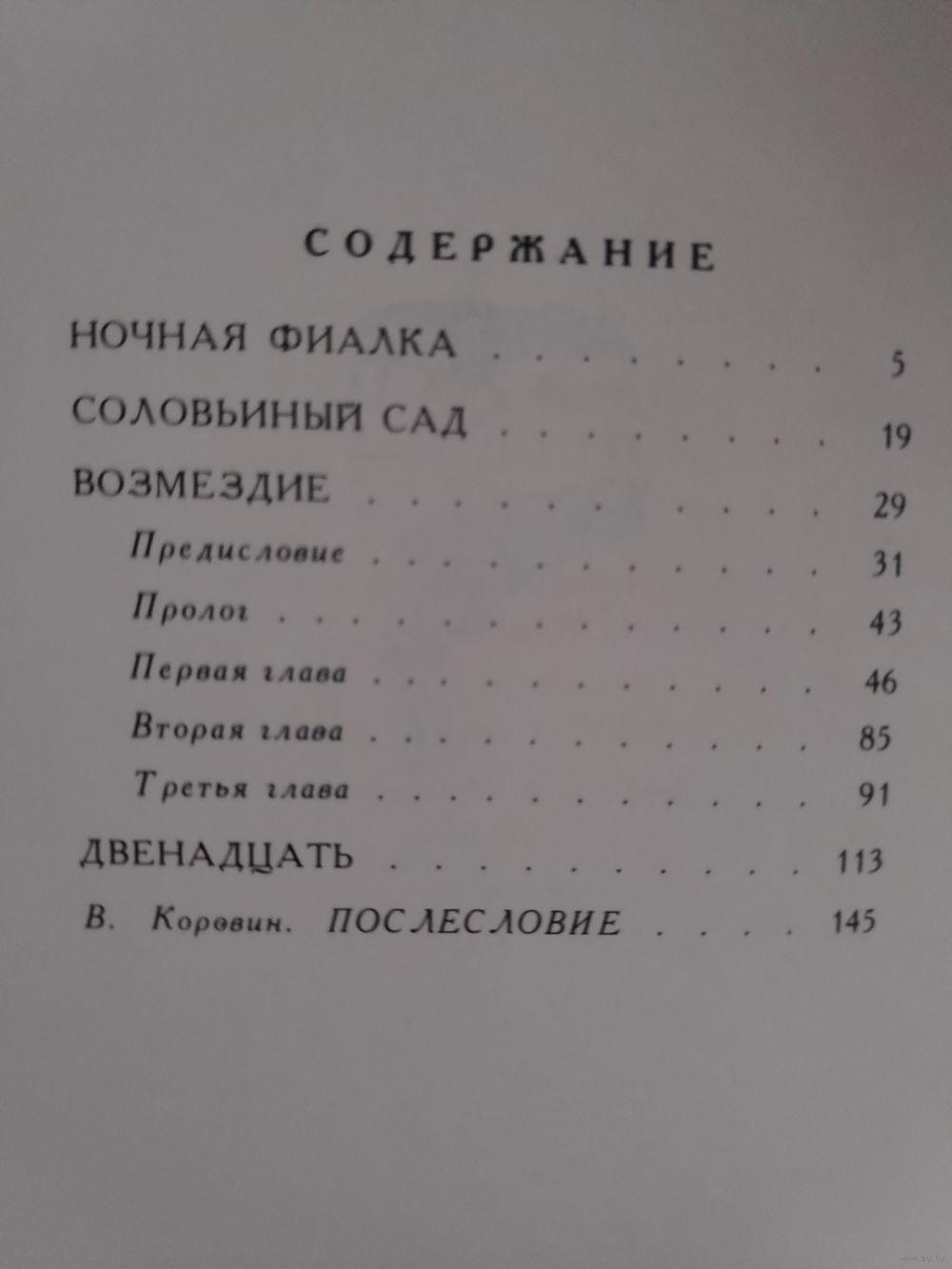 Ночная фиалка (с. 5); Соловьиный сад (с. 19); Возмездие (с. 29); Двенадцать (с. 113); В. Коровин. «Он весь - дитя любви и света» (с. 145)