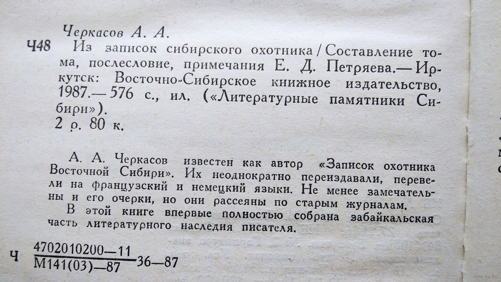 А.А. Черкасов известен как автор ` Записок охотника Восточной Сибири`. Их неоднократно переиздавали, перевели на французский и немецкий языки. Не менее замечательны и его очерки, но они рассеяны по старым журналам. В этой книге впервые полностью собрана забайкальская часть литературного наследия писателя.