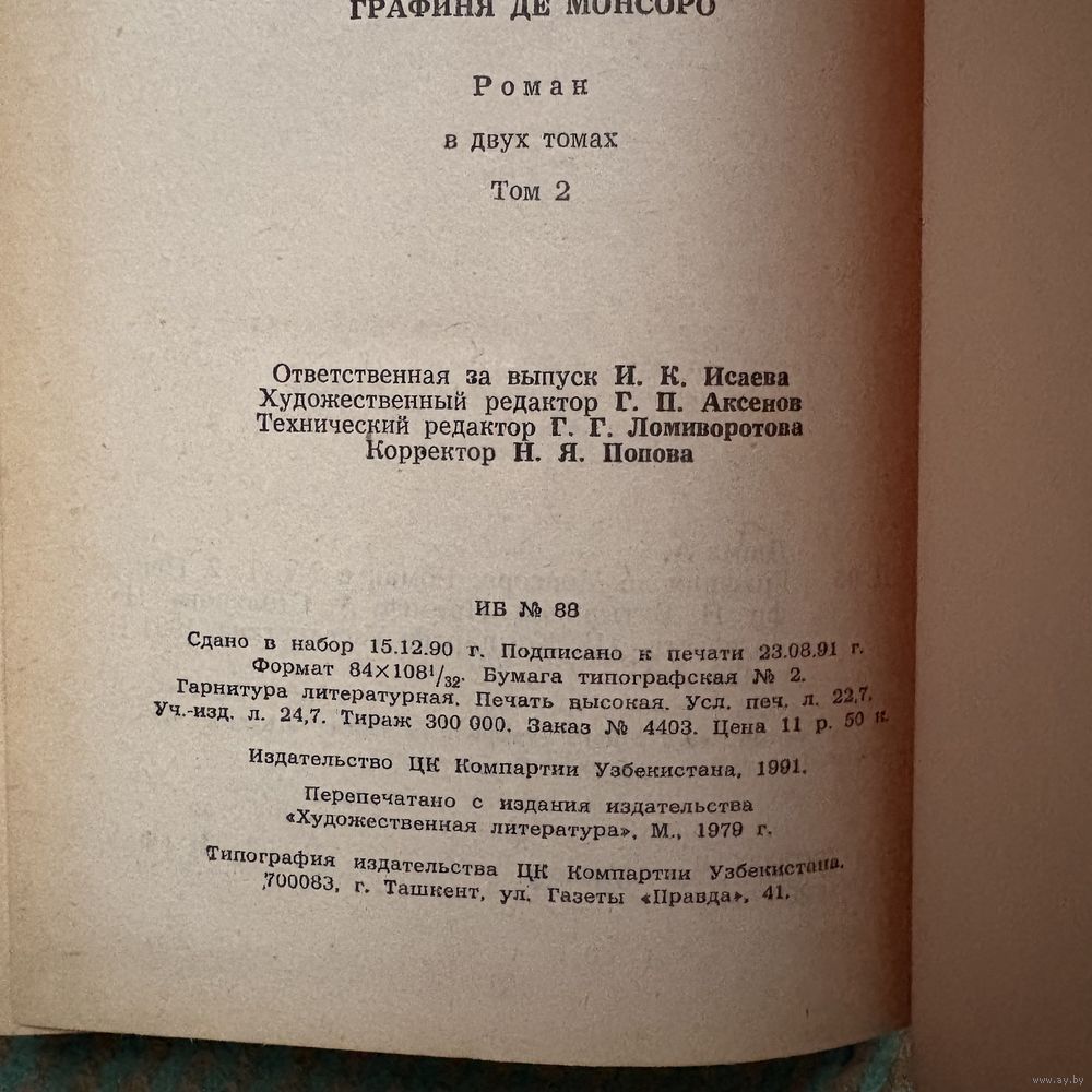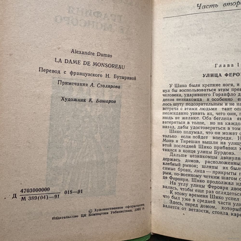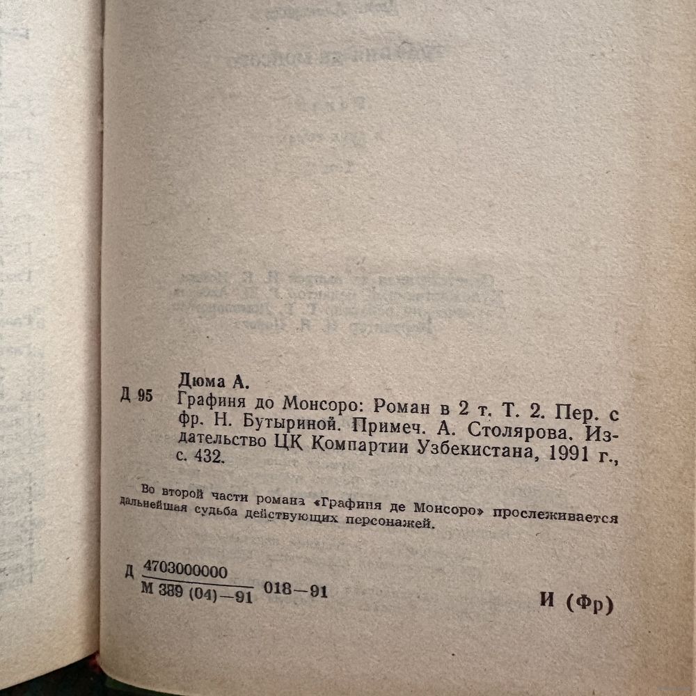 Дюма А.Д 95 Графиня до Монсоро: Роман в 2 т. Т. 2. Пер. с фр. Н. Бутыриной. Примеч. А. Столярова, Издательство ЦК Компартии Узбекистана, 1991 г., c. 432.Во второй части романа «Графиня де Монсоро» прослеживается дальнейшая судьба действующих персонажей.