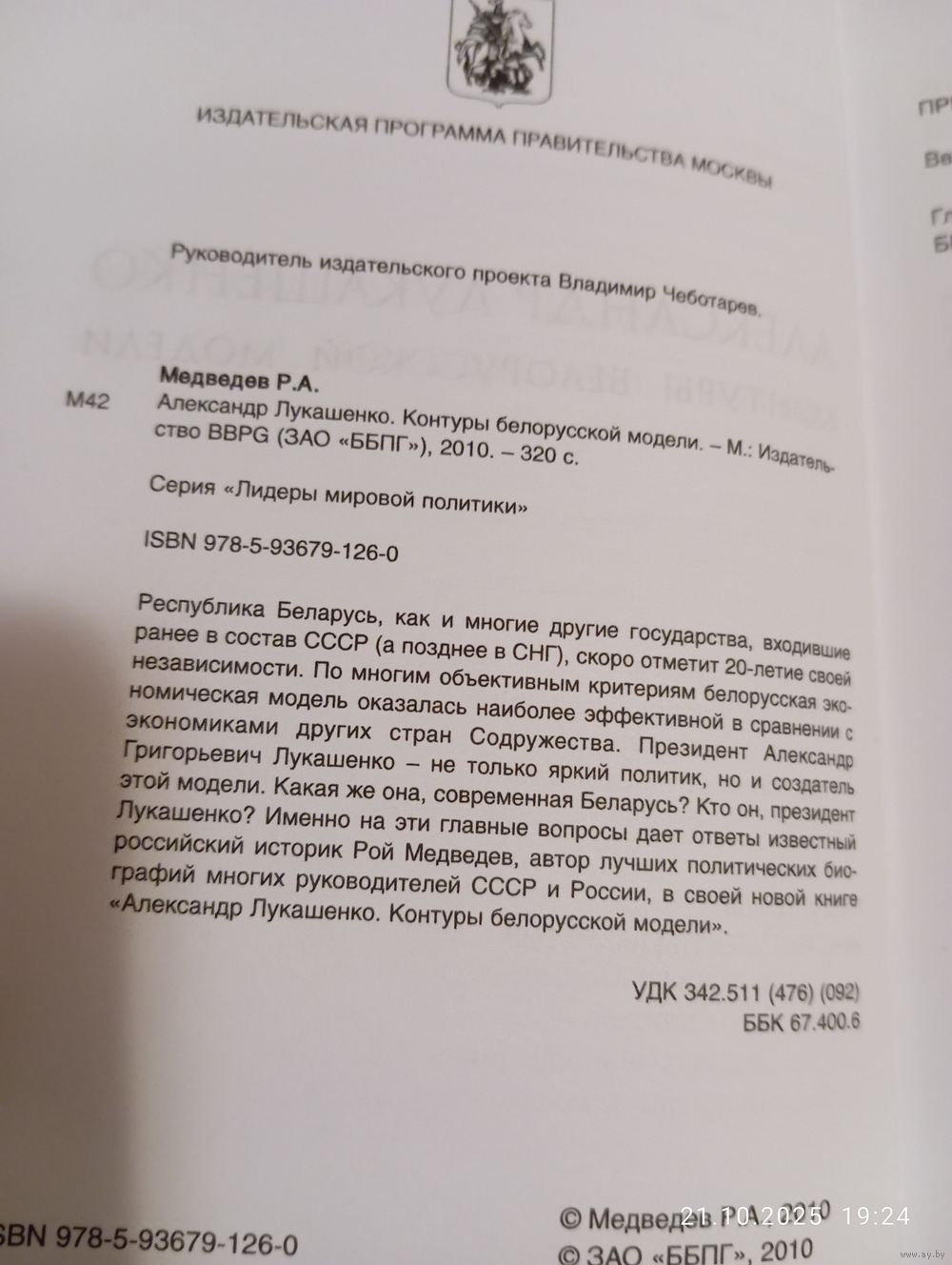Рой Медведев. Александр Лукашенко. Контуры белорусской модели. М. ББПГ 2010. В прекрасном состоянии, тв переплет. 320 с. Иллюстрации. Тираж 15000. Возможность отправки Белпочтой, полная предоплата