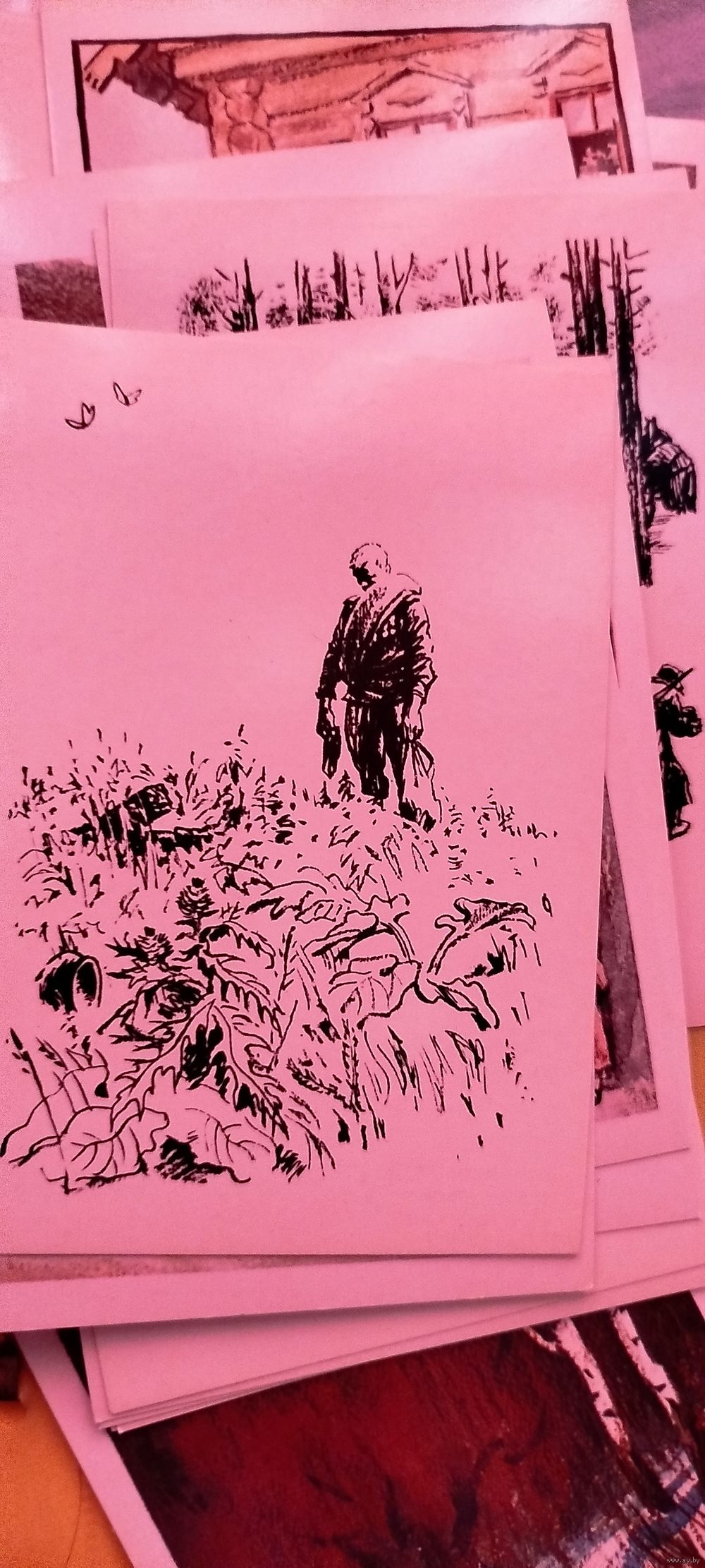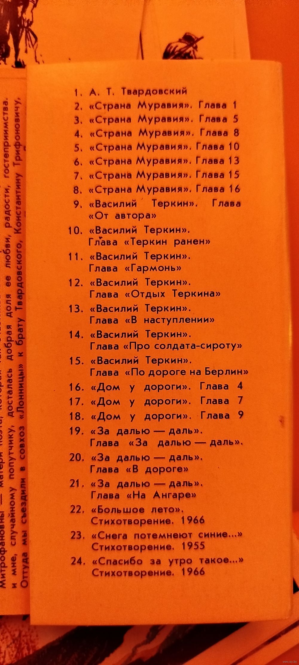 Буклет состоит из 24 открыток, на которых изображён сам Твардовский и также зарисовки к его поэмам:"Страна Муравия"., "Василий Теркин"."Дом у дороги'. Всего 24 открытки с отрывками из поэм и зарисовками художника О. Верейского.