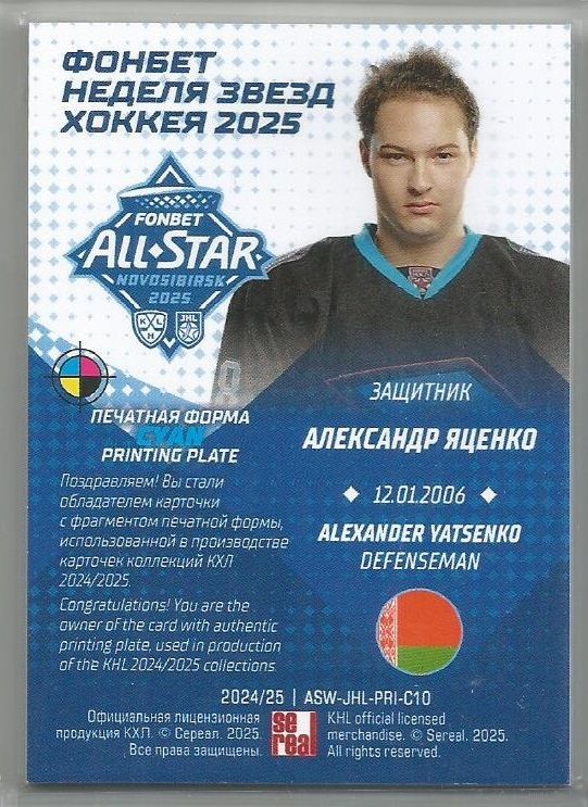Александр Яценко / "Динамо-Шинник" Бобруйск / МХЛ/ #ASW-JHL-PRI-C10 / НЗХ 2025 Новосибирск МХЛ / Печатная плата Cyan / Тираж 1/1 экз./ Коллекция "SeReal Карточки КХЛ 2024-2025. Неделя Звёзд Хоккея".
