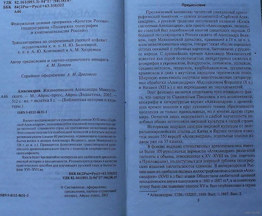 В книге воспроизводится рукописный список XVII века ``Сербской Александрии``, пользовавшейся огромной популярностью среди читателей славянских стран на протяжении нескольких столетий. Этот список отличается наибольшей полнотой и богатым иллюстративным рядом: свыше 80 миниатюр, отражающих основные события жизни и деяния Александра Великого, царя Македонии (с 336 г. до н.э.). Параллельно с факсимиле рукописи приводится фонетическая транслитерация рукописного древнеславянского текста с помощью современного русского алфавита. Книга будет чрезвычайно интересна для любителей древнеславянской истории и письменности. Рекомендуется также в качестве практического пособия для изучающих русский язык и палеографию XVI – XVII вв. Цветные и черно-белые иллюстрации на вкладных листах и в тексте. Библиография и указатели.
