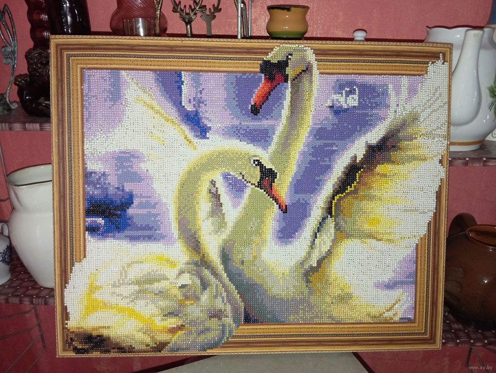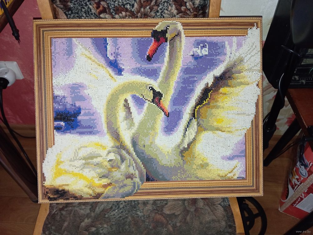 Алмазная вышивка " Лебединая пара " . 50/40 см. Готовая работа .