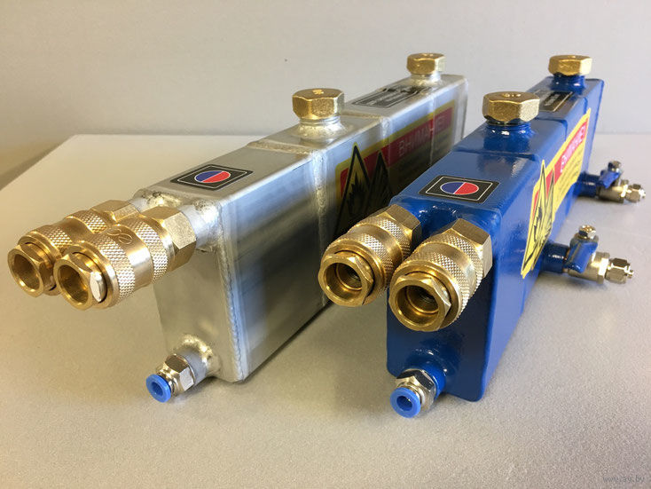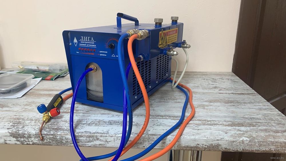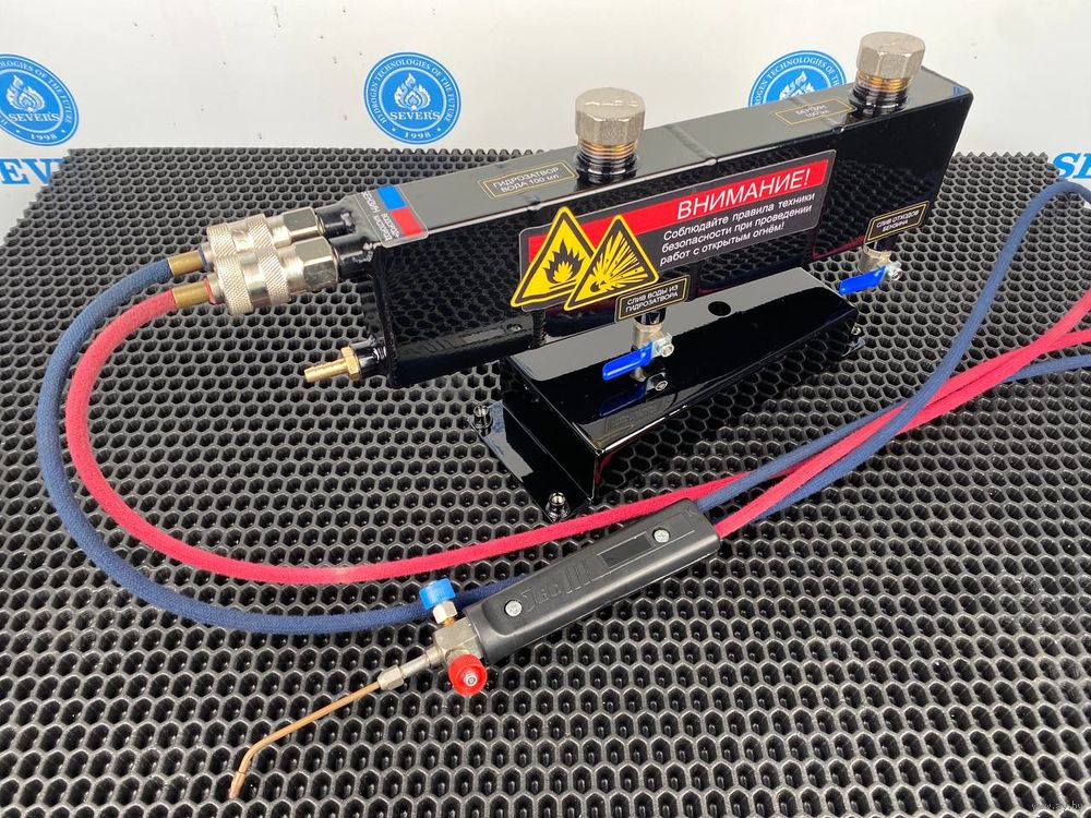 Бак изготовлен из нержавеющей стали Aisi-304, основные отличия от оригинальной конструкции: Встроенный гидрозатвор. Очень удобные и широкие горловины для заправки бензина и воды в гидрозатвор. Очень удобные шаровые вентили для слива бензина и конденсата. Пневматические быстроразъёмные механизмы для быстрого и удобного соединения рукавов горелки с баком. Рукава горелки можно отсоединять в процессе работы, без необходимости стравливания газа, так как быстроразъёмные механизмы выполняют роль запорного клапана. Система обогащения гремучего газа в баке охладителе-обогатителе выполнена совершенно по другому, в отличие от оригинальной заводской конструкции. Правый быстроразъемный коннектор служит для подачи в газовую горелку чистого гремучего газа, а быстроразъемный коннектор находящийся слева, служит для подачи в горелку смеси гремучего газа с испарениями бензина.