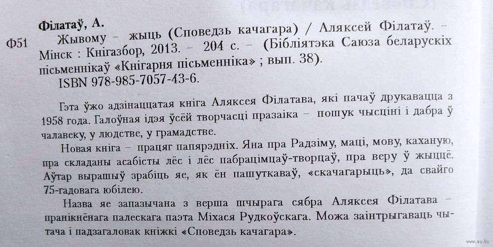 Аляксей Філатаў. Жывому - жыць: споведзь качагара. (Кнігарня пісьменніка ; вып. 38). Мінск : Кнігазбор, 2013 г. 203 с. Мяккая вокладка.